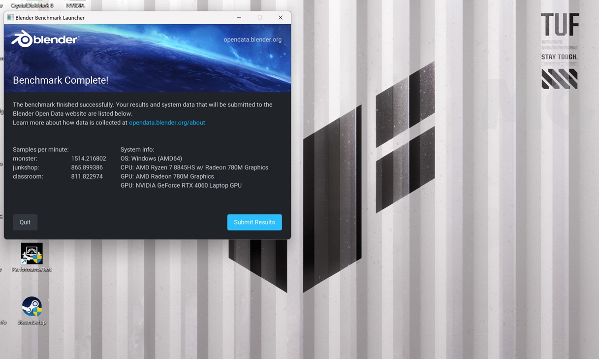 Blender es una prueba de renderizado que mide la potencia de una tarjeta gráfica en función de las muestras por minuto que es capaz de generar. Cuanto mayor sea el resultado mejor, aunque la puntuación puede variar en función del TGP y de la refrigeración de la gráfica.