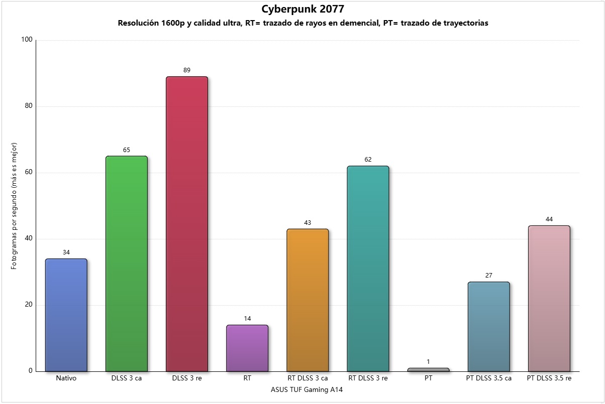 Cyberpunk 2077 se mantiene como uno de los juegos más exigentes que existen. Con la GeForce RTX 4060 podemos jugarlo a 34 FPS en nativo, y subir a 89 FPS si activamos DLSS 3. Con trazado de rayos en demencial la experiencia es buena al activar DLSS 3 en modo rendimiento, ya que pasamos de 14 FPS a 62 FPS.