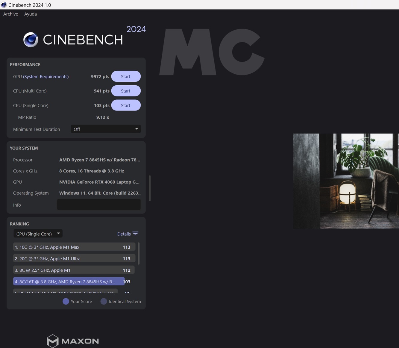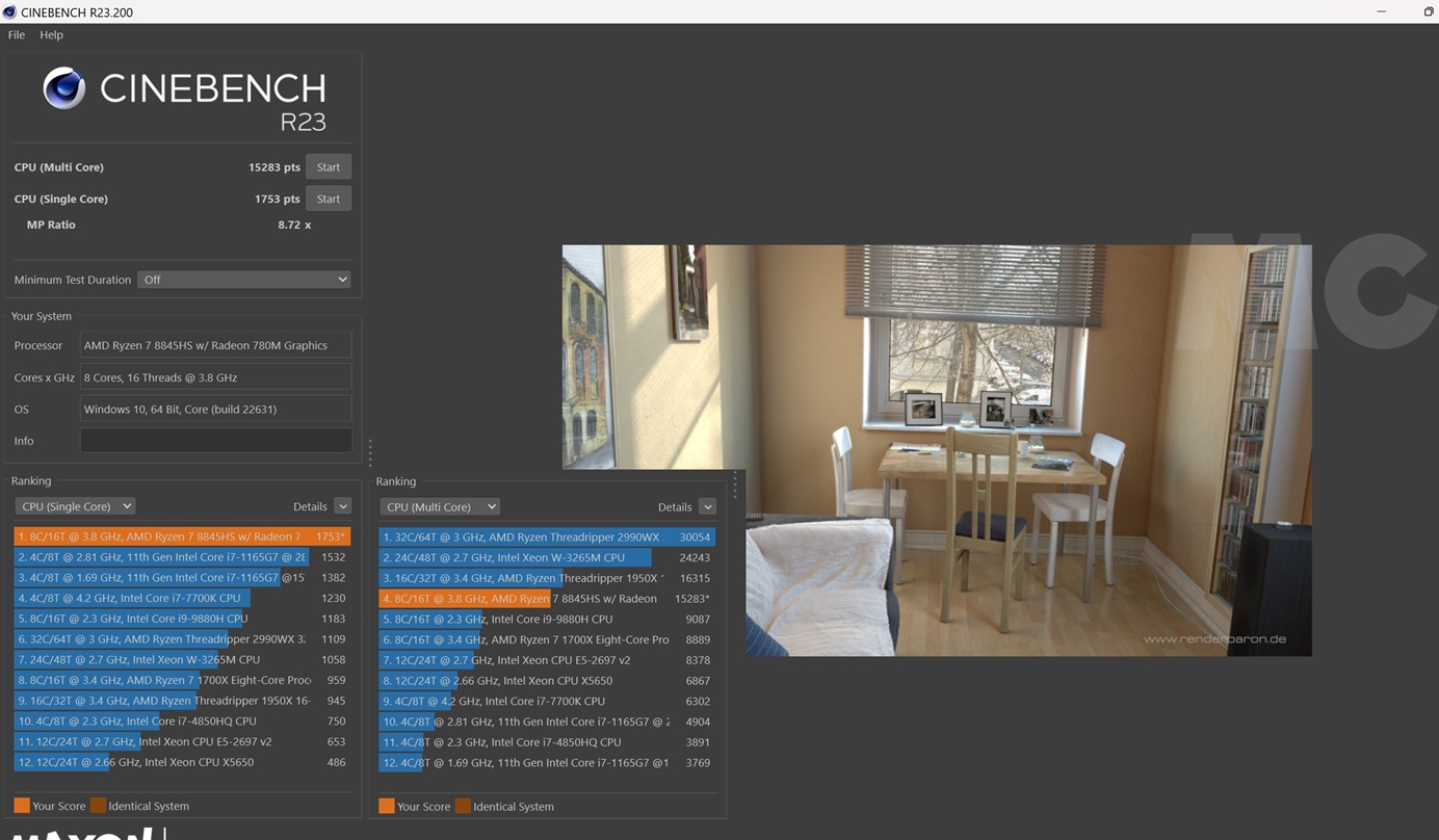 Esta prueba de renderizado nos permite medir el rendimiento del procesador con un hilo activo, y también en un régimen de carga del 100%. El Ryzen 7 8845HS consigue una puntuación de 1.753 en monohilo y 15.283 en multihilo, números muy buenos para un equipo de solo 14 pulgadas tan compacto y ligero.