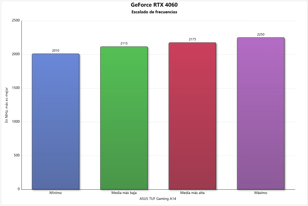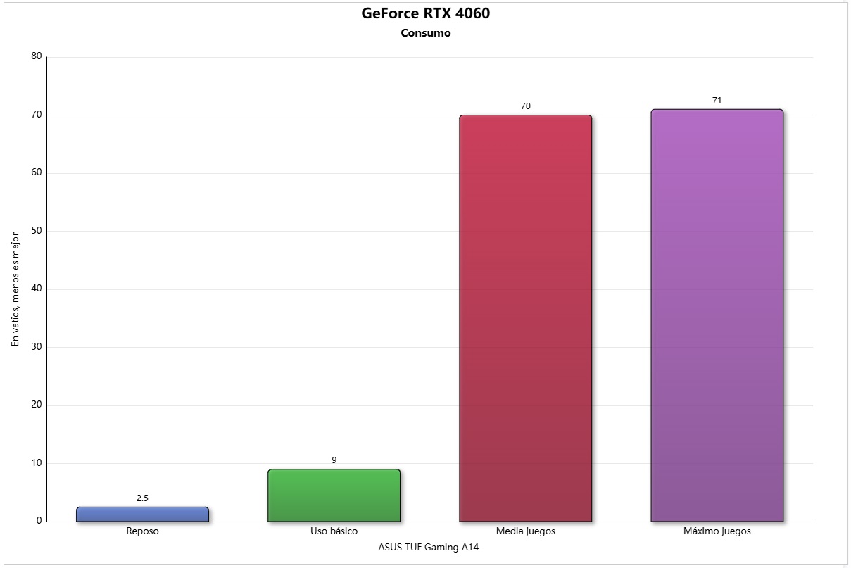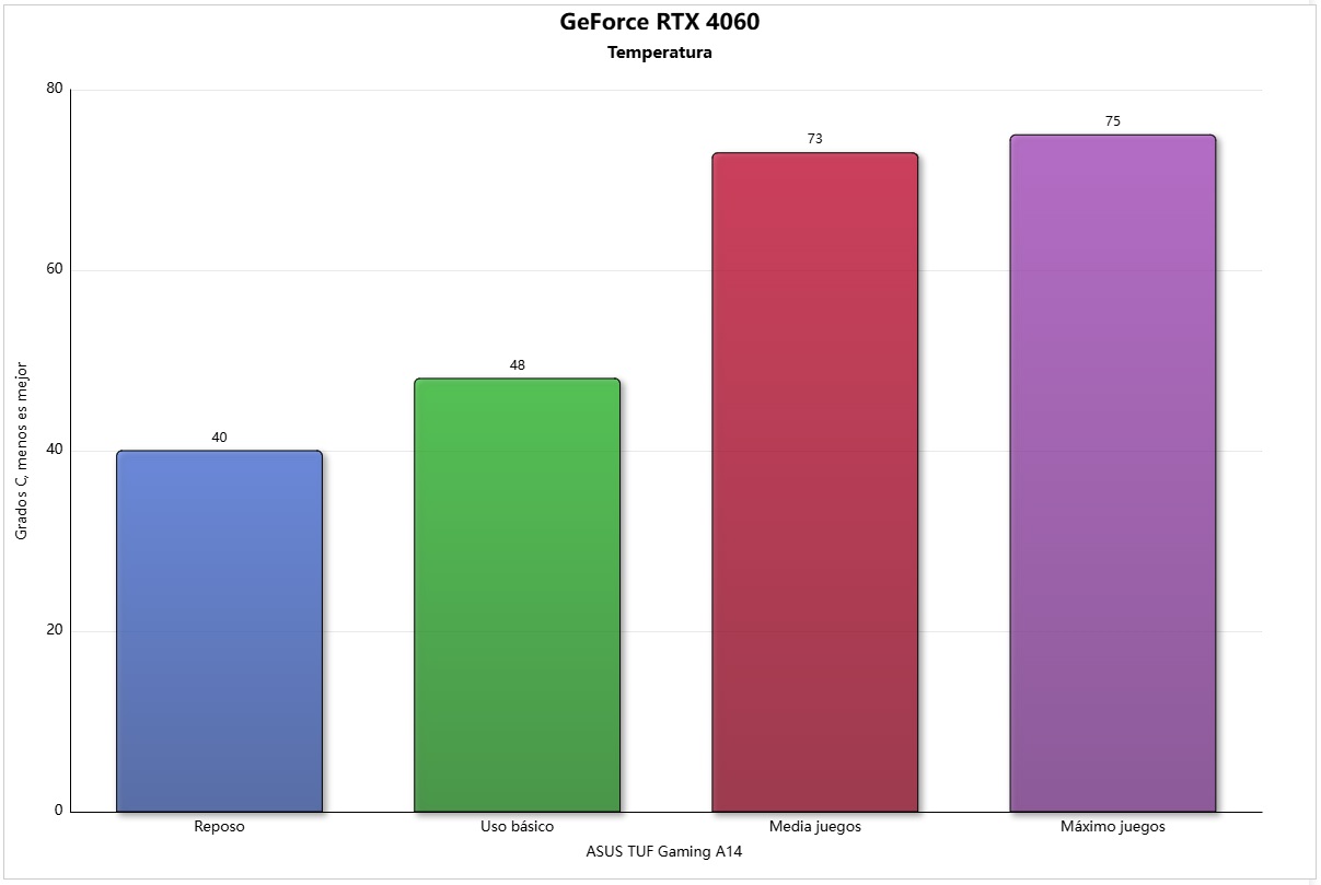 La GeForce RTX 4060 que monta el ASUS TUF GAMING A14 ha logrado un resultado excelente, ya que sus puntuaciones son prácticamente las mismas que podemos encontrar en portátiles de mayor tamaño y peso que montan esa misma gráfica.
