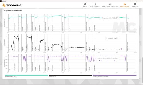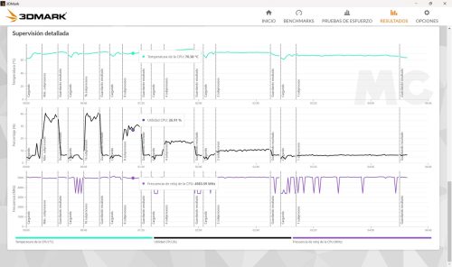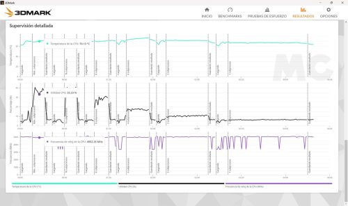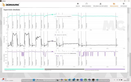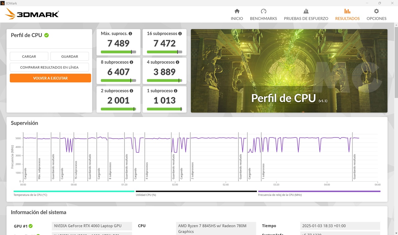 El Ryzen 7 8845HS tiene una velocidad máxima de 5,1 GHz, pero solo con un hilo activo, y como vemos en esta prueba es capaz de alcanzarla y de mantenerla sin problemas. En general las velocidades que registra son elevadas y muy estables, y esto se traduce en un rendimiento consistente. Por otro lado, las temperaturas se mantienen siempre en valores seguros, así que no tendremos problemas de estabilidad ni de estrangulamiento térmico.