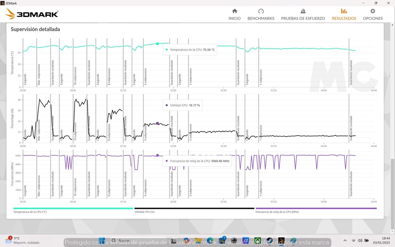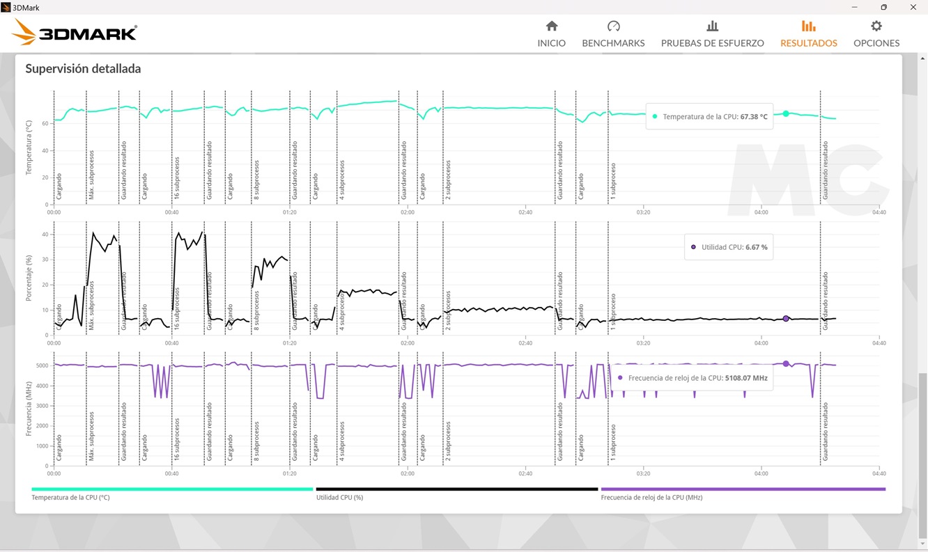Volvemos a centrarnos en la CPU, pero no solo para medir de nuevo su rendimiento, sino también para ver cómo escalan la velocidad y la temperatura con diferentes cargas de trabajo, ya que esta prueba se aplica en diferentes fases para saturar primero un hilo, luego dos hilos y así va subiendo gradualmente en números pares hasta llegar al máximo número de hilos del procesador.