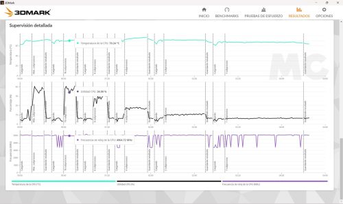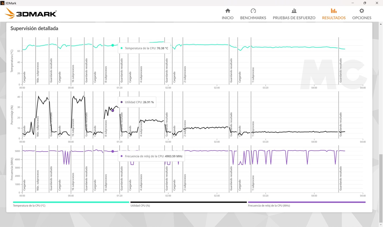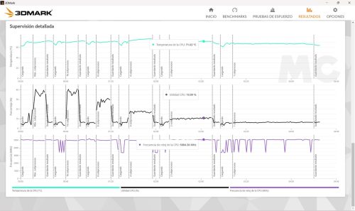 - Con dos hilos activos la velocidad de trabajo es también bastante estable y se mantiene sin problemas en 5,08 GHz. La temperatura alcanza un pico de 71,63 grados C.