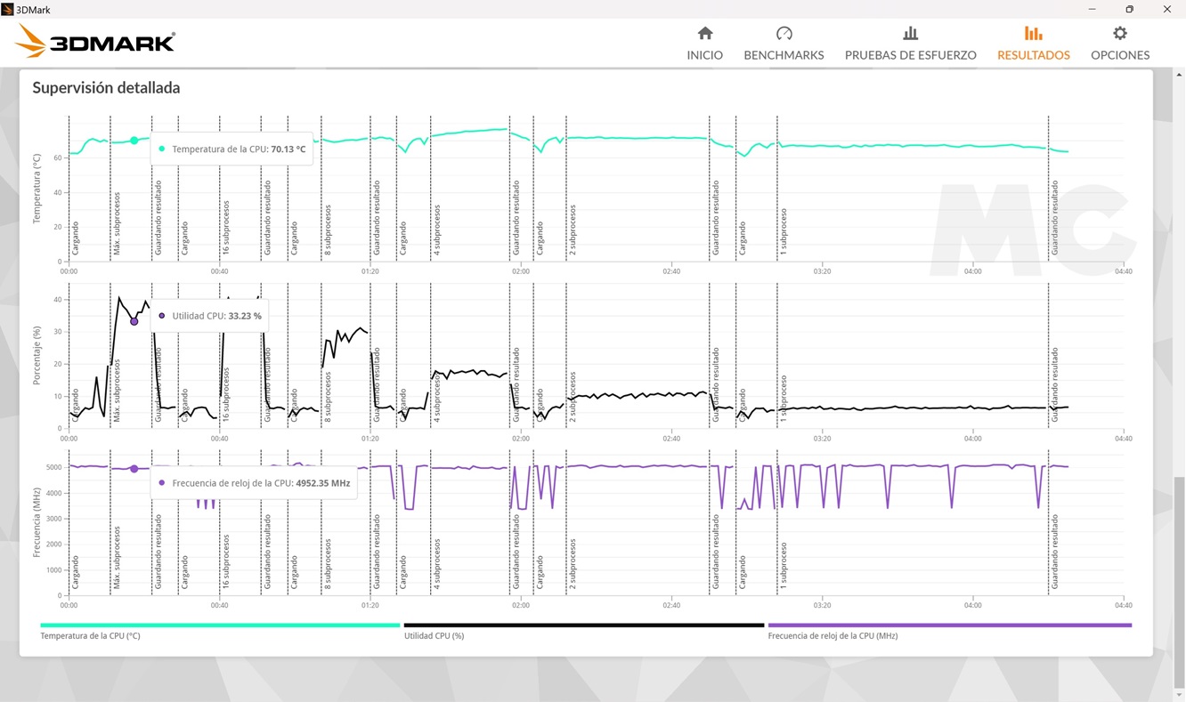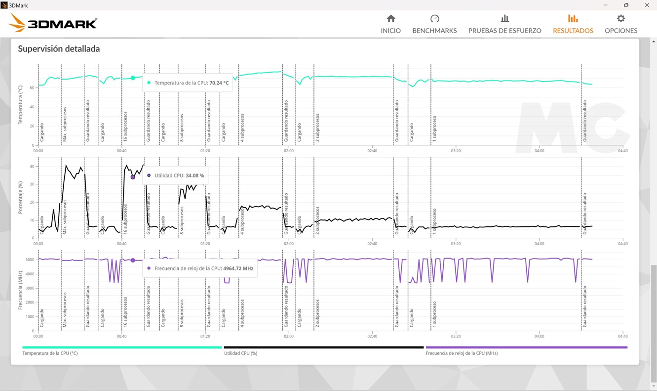 - Con 16 hilos activos llegamos al techo de este procesador, y hay muy pocos cambios frente a la fase anterior, ya que mantiene una velocidad de 4,96 GHz sin problemas de estabilidad y la temperatura también ronda los 70 grados C.