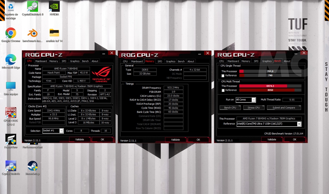 Sé que estáis deseando que hable del rendimiento, y tranquilos, que no os voy a hacer esperar más. El ASUS TUF GAMING A14 mueve Windows 11 con una fluidez absoluta, y gracias a sus 32 GB de memoria RAM y a su CPU de ocho núcleos y dieciséis hilos está preparado para trabajar incluso con aplicaciones bastante pesadas.