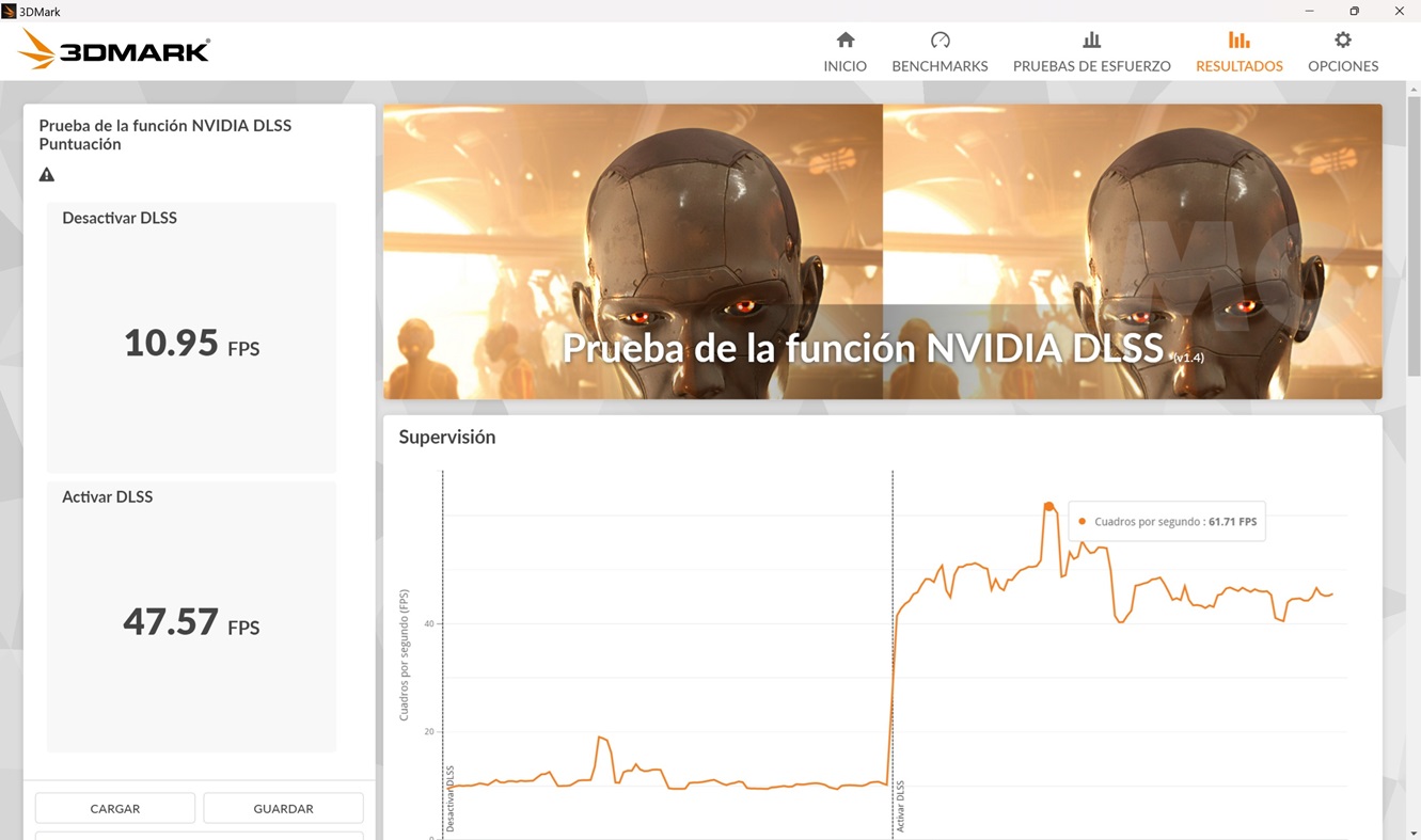 En esta prueba la escena se renderiza en 4K y presenta una carga gráfica muy exigente. Con la GeForce RTX 4060 conseguimos una media de 10,95 FPS sin DLSS 3, y esa media sube a 47,57 FPS al activar esa tecnología en modo rendimiento. Tenemos casi cinco veces más fotogramas por segundo.