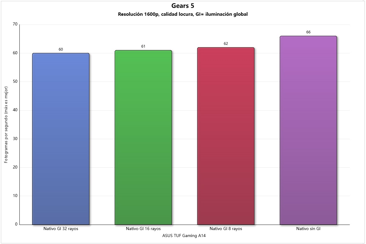 Gears 5 es un ejemplo de lo que puede dar de sí el Unreal Engine 5, y en calidad locura puede ser todavía muy exigente. El ASUS TUF Gaming A14 no tiene problemas para moverlo a 60 FPS incluso con iluminación global activada en 32 rayos.