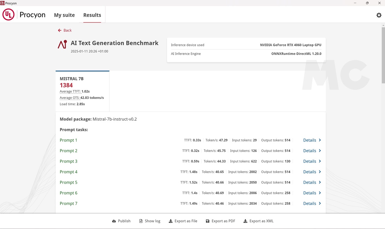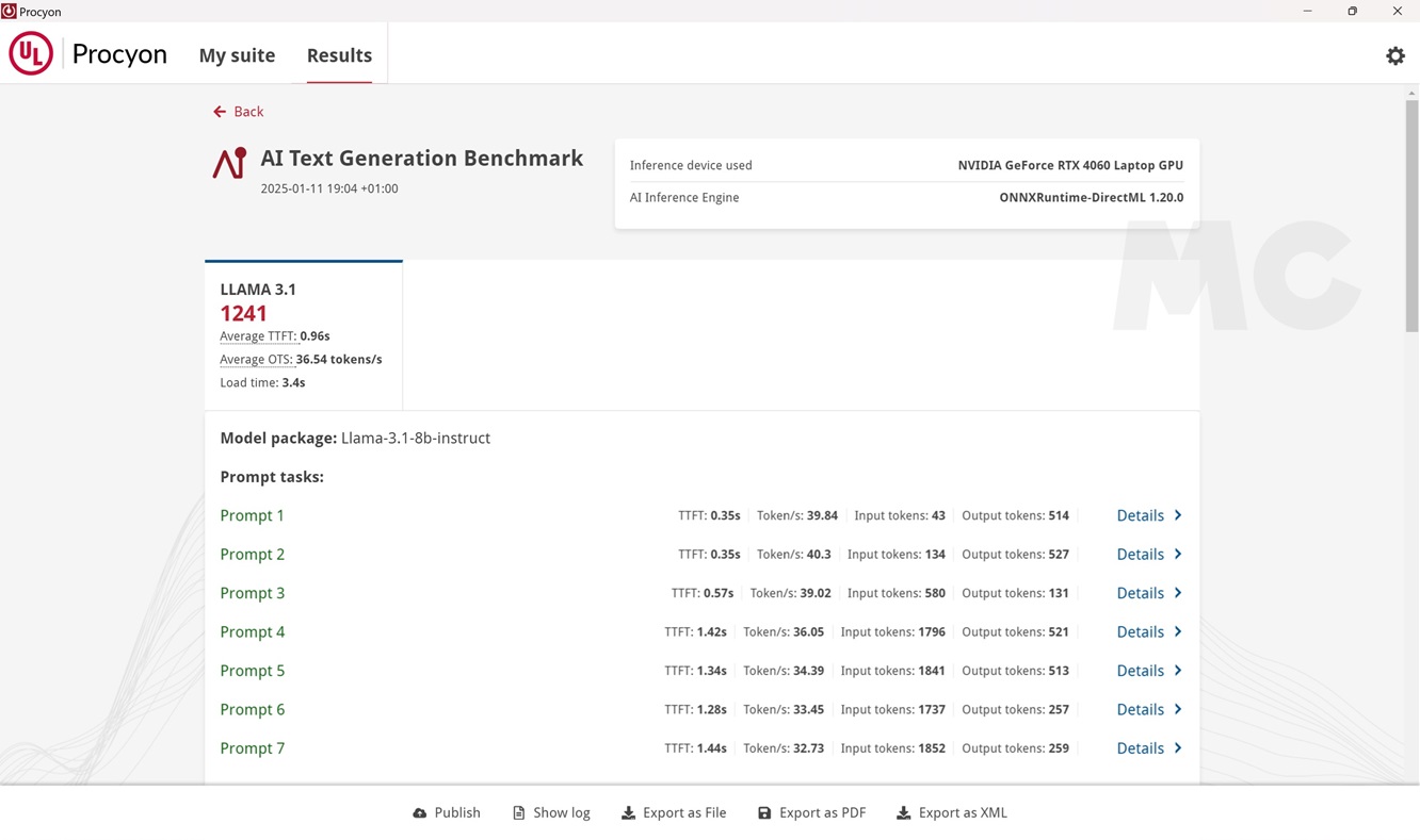 En Llama 3.1 logra una puntuación de 1.241, y en Mistral 7B consigue 1.384 puntos. En las imágenes podéis ver los valores más importantes de ambas pruebas, como el tiempo de carga y la cantidad de tokens por segundo.