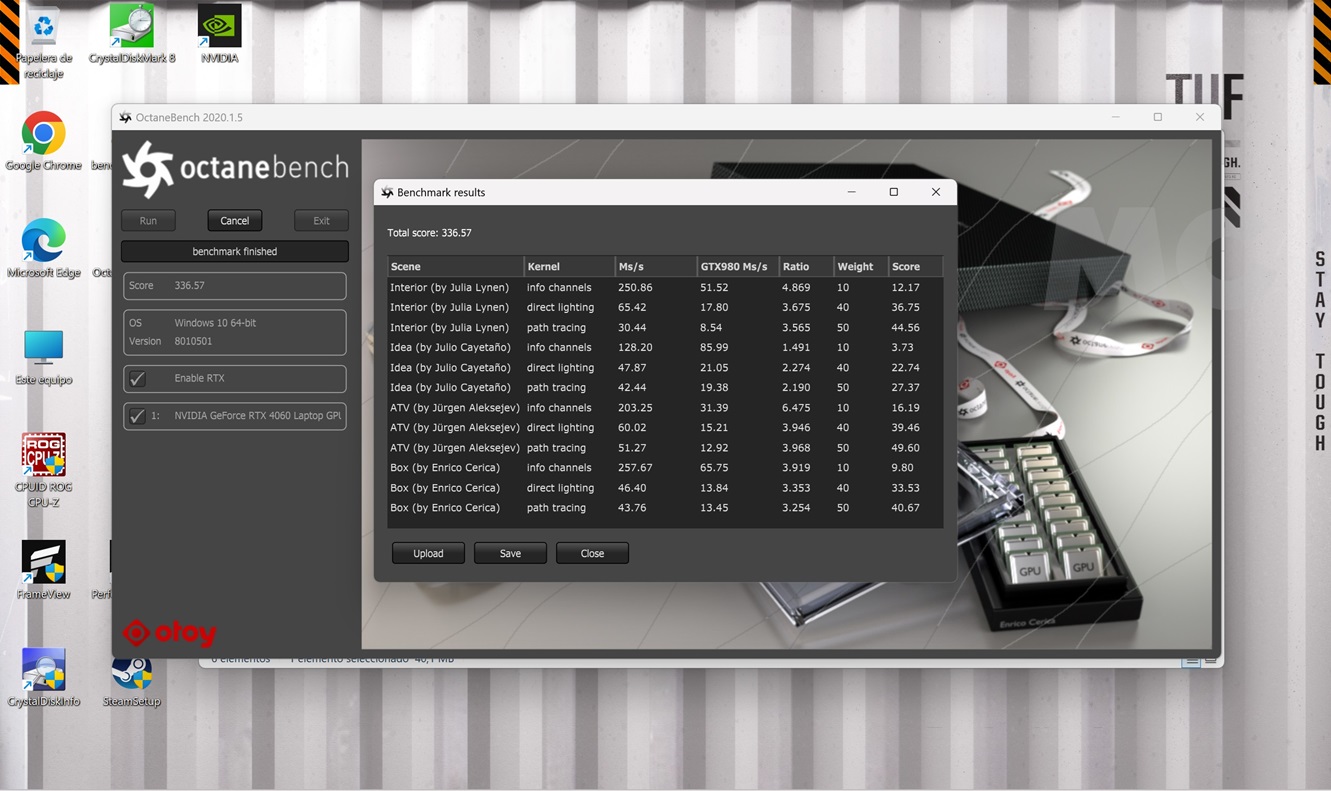 Una prueba de renderizado que aprovecha la aceleración por hardware de trazado de rayos que tiene la GeForce RTX 4060. La puntuación que obtiene confirma que es una tarjeta gráfica bastante potente, y que llega a multiplicar casi por cinco el rendimiento de una GeForce GTX 980.
