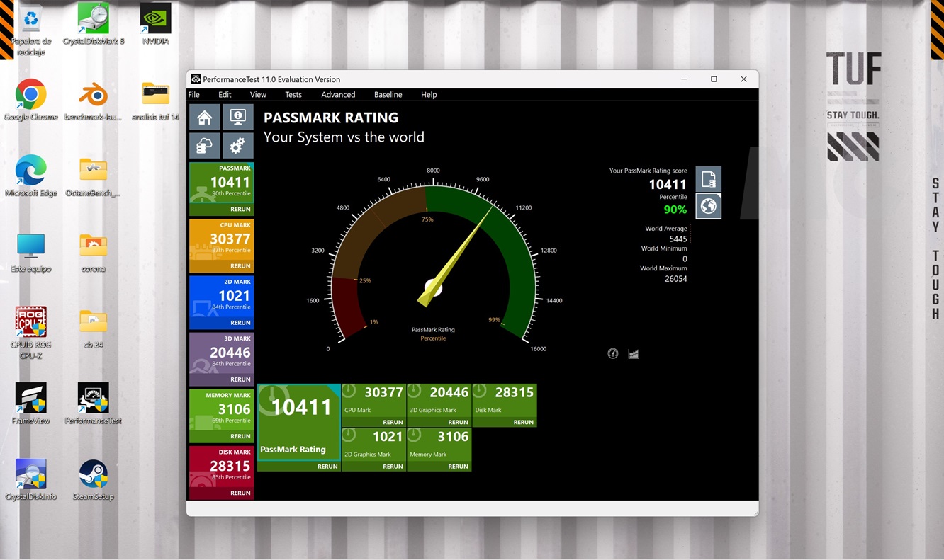 Con PassMark podemos medir el rendimiento general de un equipo, y el ASUS TUF Gaming A14 ha logrado posicionar por encima del 90% de los equipos que tiene este benchmark en su base de datos, lo que equivale a un resultado sobresaliente.