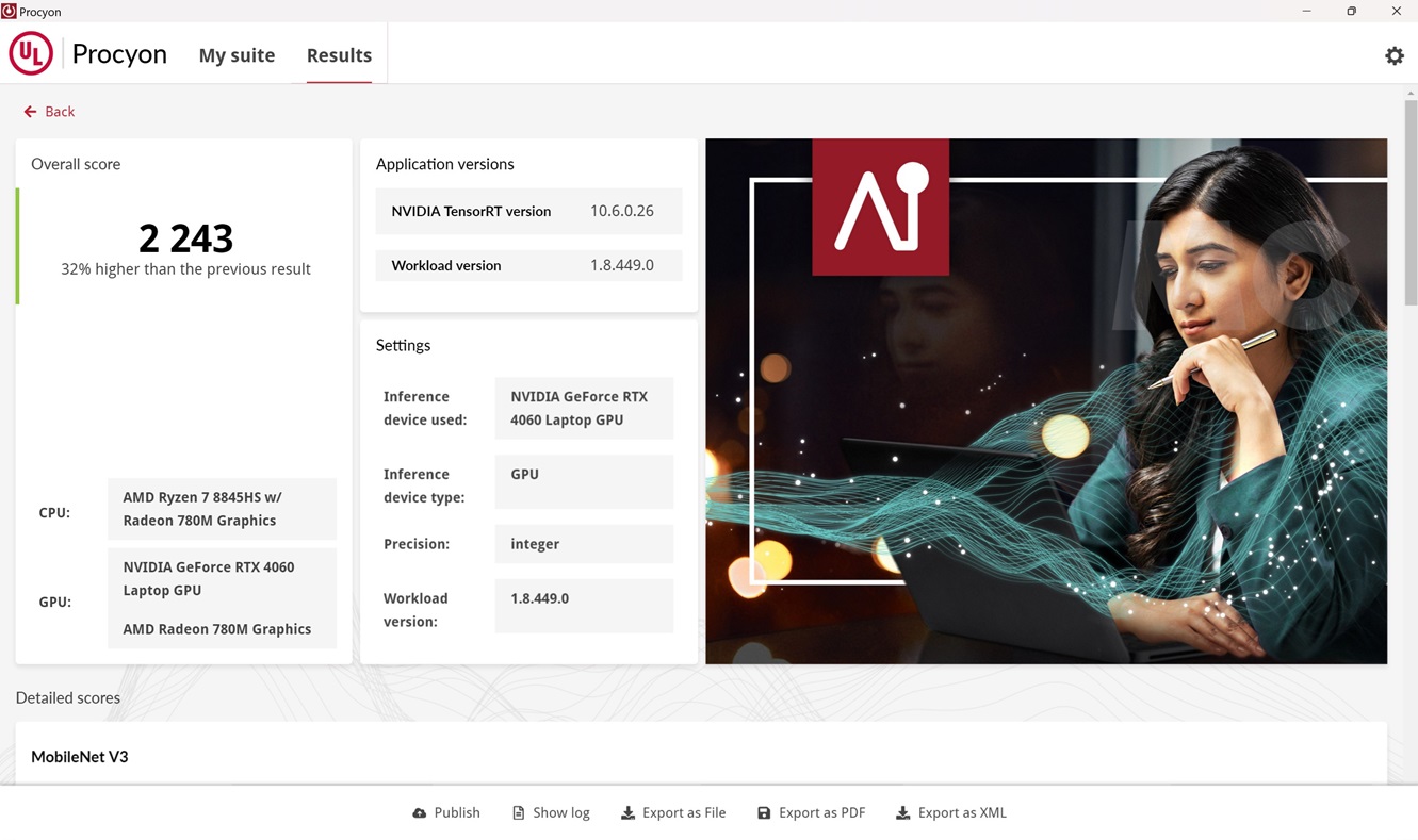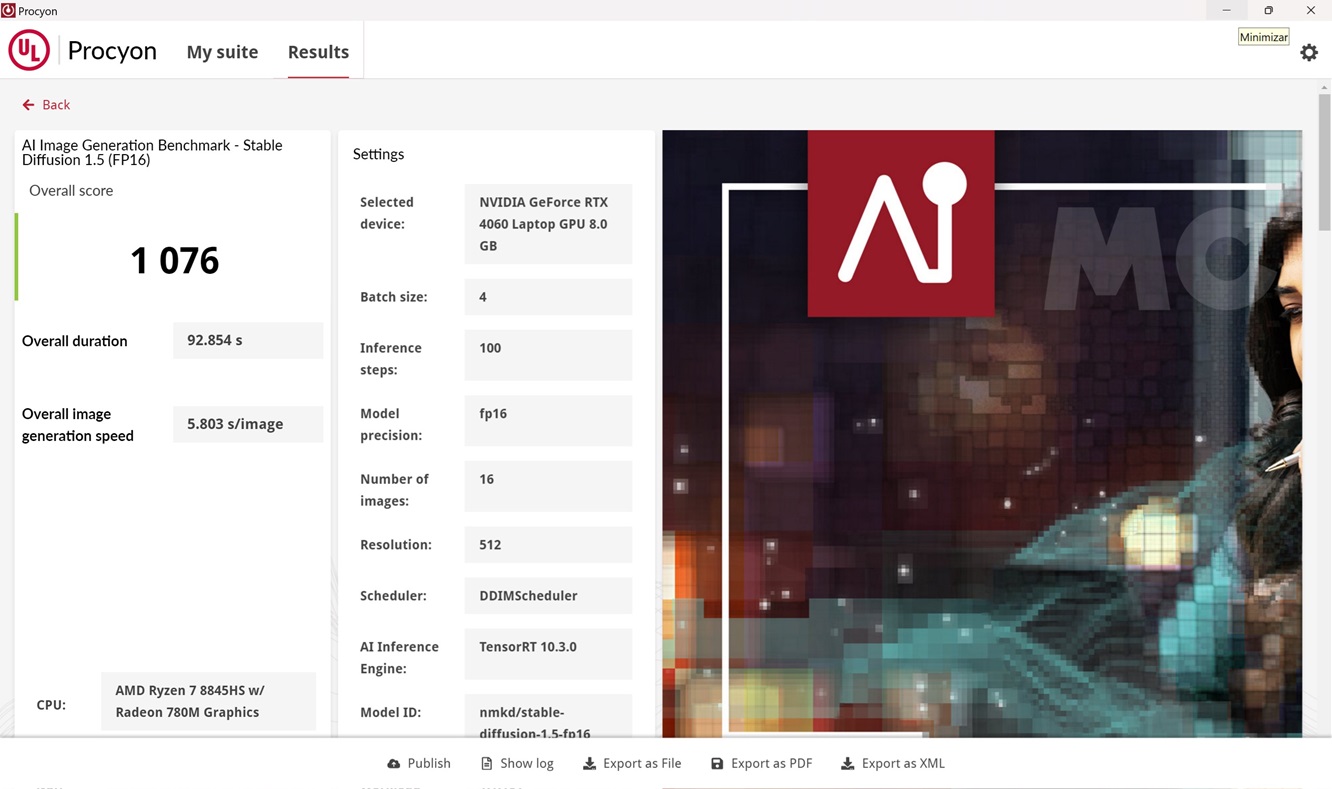 Saltamos de lleno a las pruebas centradas en IA. El ASUS TUF Gaming A14 tiene una NPU de solo 16 TOPs, así que esta no ofrece la capacidad suficiente para disfrutar de funciones de IA avanzadas. Por suerte no es un problema, porque la GeForce RTX 4060 tiene hardware especializado en IA que es capaz de ofrecer un alto rendimiento.