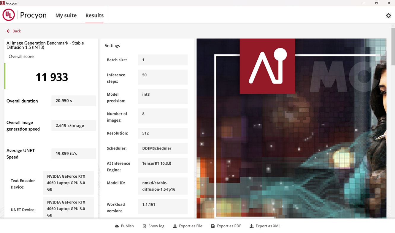 En la prueba de generación de imágenes bajo FP16 tenemos una puntuación de 1.076, y bajo INT8 en esa misma prueba la GeForce RTX 4060 consigue 11.933 puntos. Son resultados muy buenos que confirman la potencia que tiene esta gráfica y la diferencia que marca el motor de inferencia TensorRT de NVIDIA.