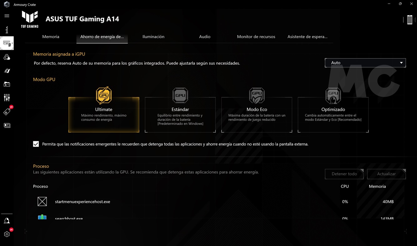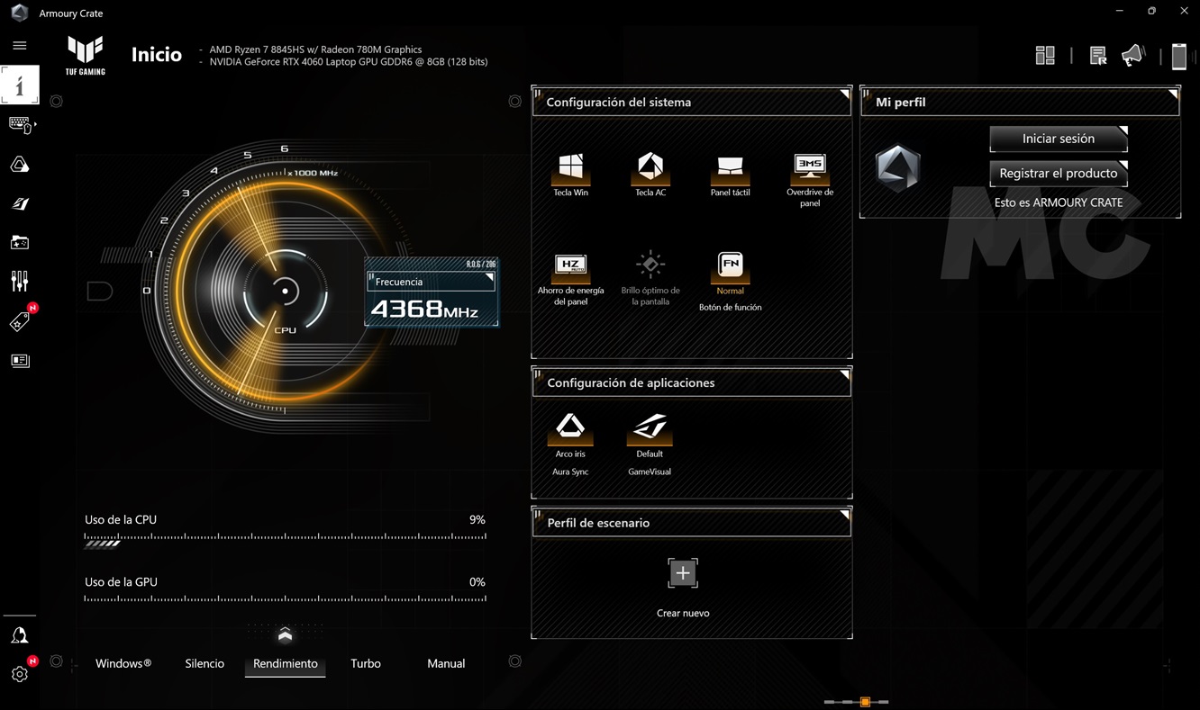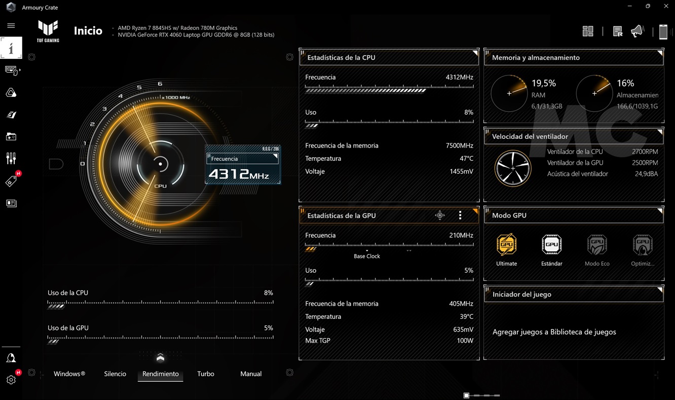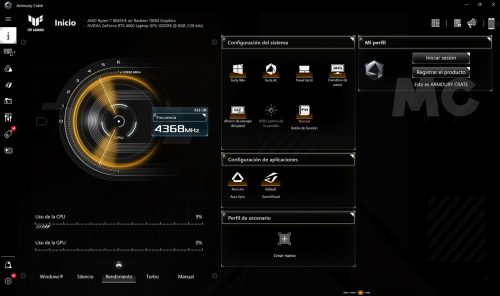 Y hablando de perfiles de rendimiento, el ASUS TUF GAMING A14 viene con el software ROG Armoury Crate preinstalado, que nos permite elegir entre diferentes modos de rendimiento, activar el conmutador MUX, ver el estado del equipo, monitorizar la temperatura de la CPU y realizar diferentes ajustes. La interfaz es sencilla e intuitiva, rinde bien y es totalmente estable.