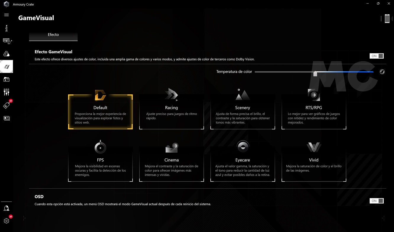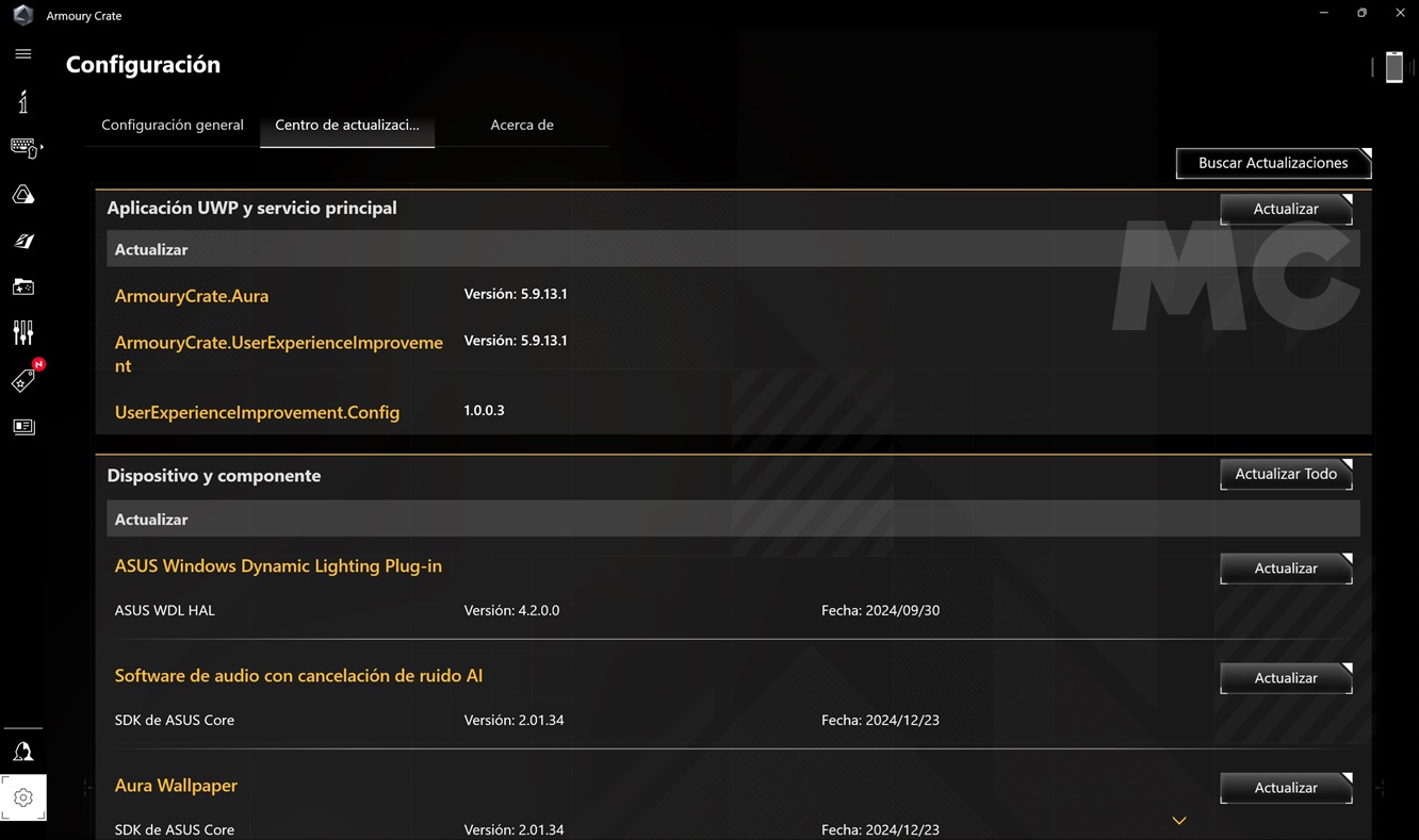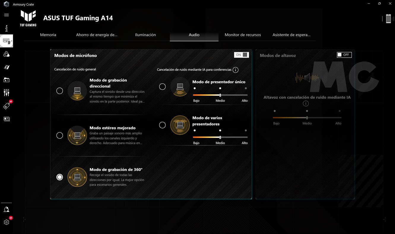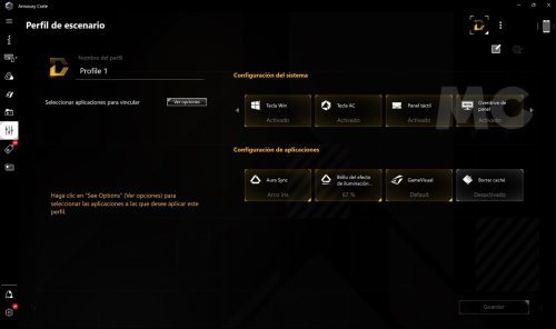 Y hablando de perfiles de rendimiento, el ASUS TUF GAMING A14 viene con el software ROG Armoury Crate preinstalado, que nos permite elegir entre diferentes modos de rendimiento, activar el conmutador MUX, ver el estado del equipo, monitorizar la temperatura de la CPU y realizar diferentes ajustes. La interfaz es sencilla e intuitiva, rinde bien y es totalmente estable.