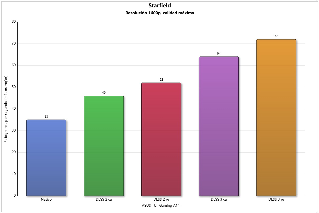 Abrimos con Starfield, un juego muy exigente tanto a nivel de CPU como de GPU que funciona muy bien en el ASUS TUF Gaming A14, incluso en resolución nativa. Si activamos DLSS 3 en modo rendimiento podemos pasar de 35 FPS a 72 FPS, más del doble, y sí, la experiencia es totalmente fluida.