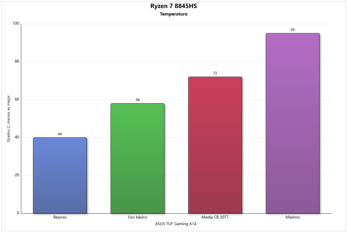 Teniendo en cuenta la configuración del ASUS TUF Gaming A14 es un buen resultado, ya que este equipo no utiliza componentes de bajo consumo, y su Ryzen 7 8845HS está formado únicamente por núcleos de alto rendimiento.