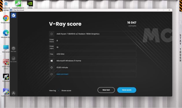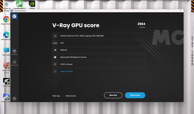 Esta es otra prueba de renderizado muy exigente, en la que podemos utilizar la aceleración que brinda el hardware especializado de la GeForce RTX 4060. En CUDA tenemos 1.872 vpaths, y en el modo RTX conseguimos 2.984 vpaths. Para que podáis comparar, una GeForce RTX 4070 con un TGP similar consigue 2.008 vpaths y 3.072 vpaths, respectivamente.