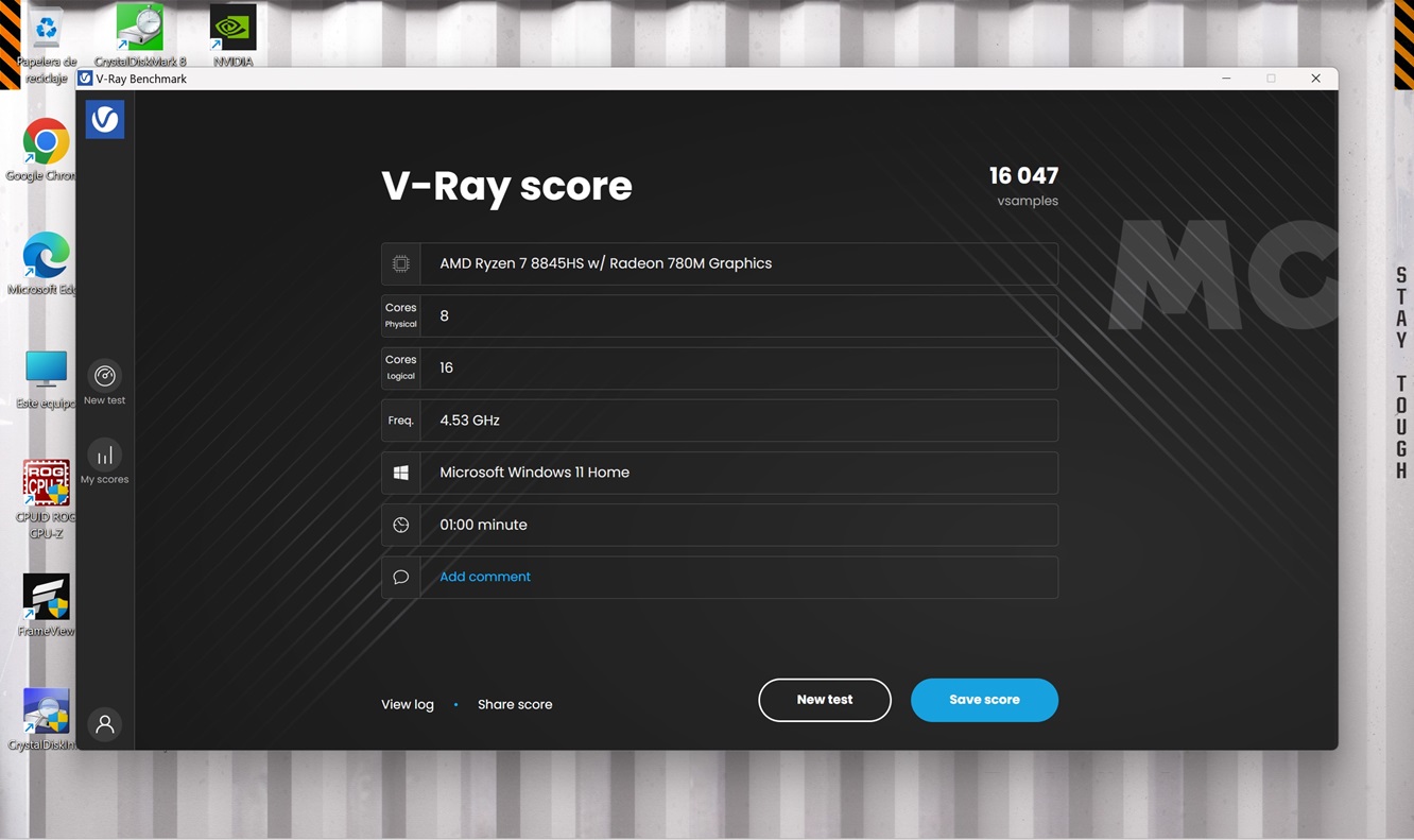Esta es una versión actualizada de la prueba anterior, con la que ahora podemos medir también el rendimiento de la gráfica dedicada. El Ryzen 7 8845HS vuelve a conseguir un buen resultado con 103 puntos en monohilo y 941 puntos en multihilo, y la GeForce RTX 4060 se queda a las puertas de los 10.000 puntos.