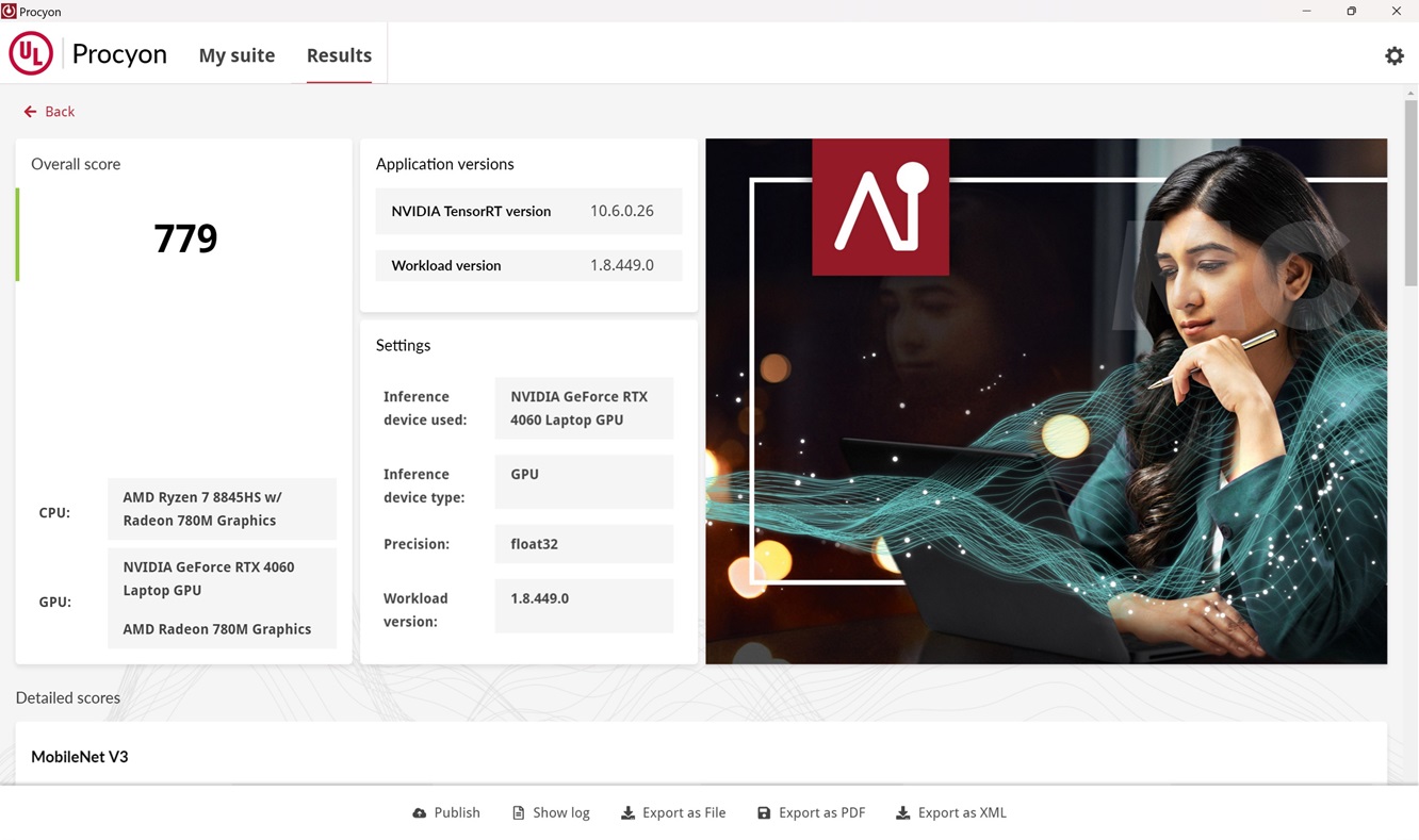 En la prueba de visión bajo FP32, que es extremadamente exigente, tenemos una puntuación de 779, un resultado muy positivo ya que queda muy cerca de la puntuación que obtiene una NPU de nueva generación en FP16.