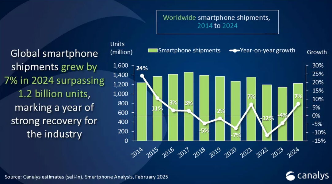El mercado mundial del móvil volvió a crecer en 2024 tras dos años consecutivos de caída, según el informe de Canalys. Como previsión para este año, la consultora habla de «incertidumbre», por las fluctuaciones económicas, los aranceles estadounidenses y otros desafíos.