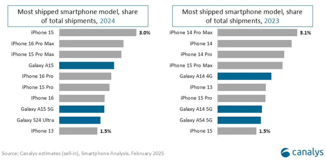 Canalys también ha publicado listado del top-10 de modelos más vendidos y aquí Apple arrasa colocando tres terminales a la cabeza del mercado, iPhone 15, iPhone 16 Pro Max y iPhone 15 Pro Max.