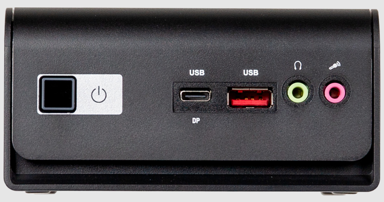 Su nivel de conectividad no está mal para su tamaño y nivel de hardware, con dos puertos USB-C 3.2 Gen 2, dos puertos USB-A 3.2 Gen 2 y HDMI. Se pueden utilizar varios monitores simultáneamente ya que los dos puertos USB tienen soporte para Display Port, además de la interfaz física HDMI. Además de un puerto LAN Gigabit Ethernet, se puede agregar conectividad inalámbrica a través de la ranura M.2 2230 para Wi-Fi y Bluetooth. También dispone de salida/entrada de audio con los conectores jack separados para micrófono y auriculares.