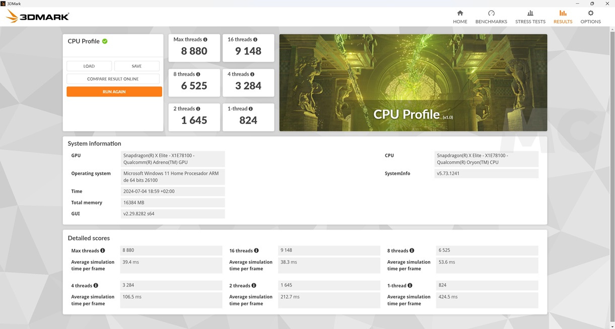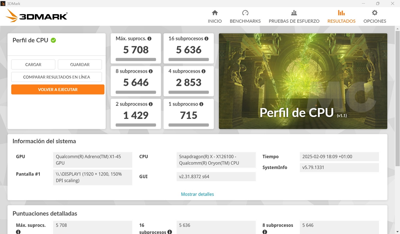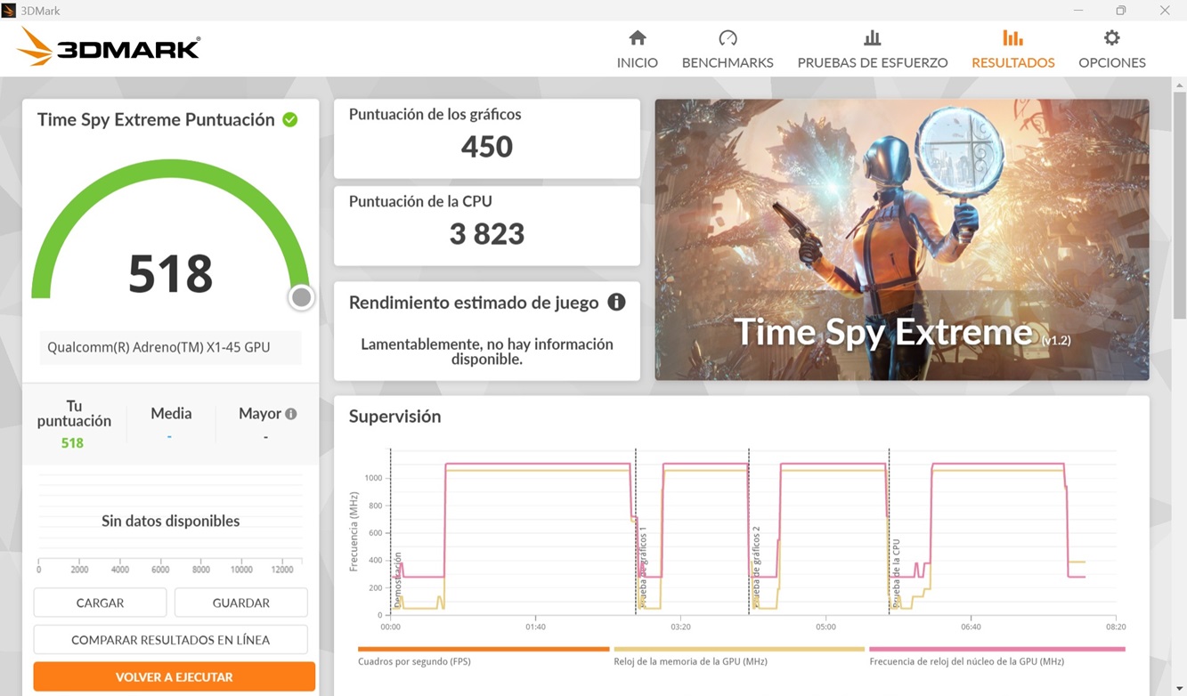 Curiosamente, sí que me dejó ejecutar la prueba Time Spy Extreme, aunque esta es demasiado exigente para el Snapdragon X X1 26 100, como podemos ver por las puntuaciones obtenidas tanto en CPU como GPU.