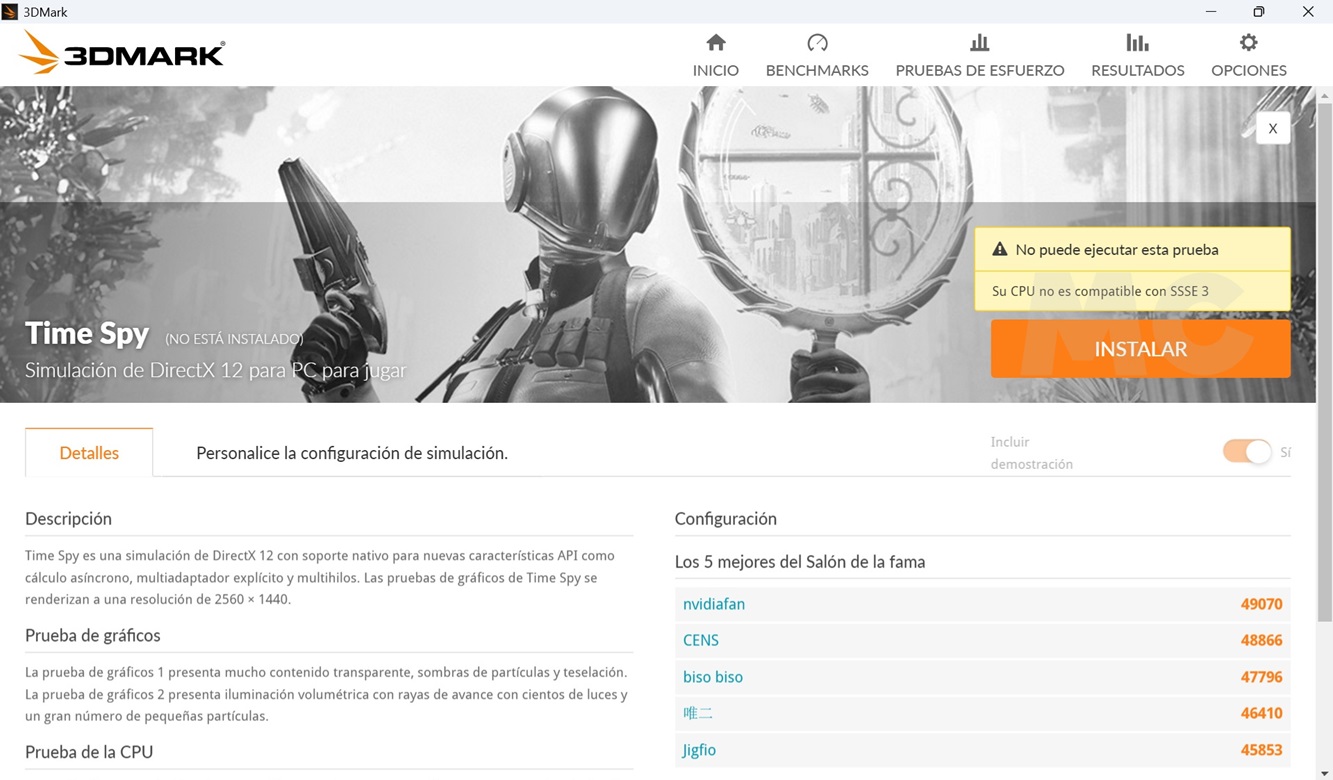 Intenté ejecutar Time Spy, pero recibí un mensaje de error y no pude ejecutar esta prueba con el SoC Snapdragon X X1 26 100.