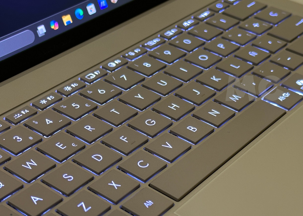 • Teclado de tipo chiclet con un recorrido por pulsación de 1,3 mm y retroiluminación LED en color blanco. Tienen una ligera concavidad de 0,1 mm para mejorar la ergonomía.