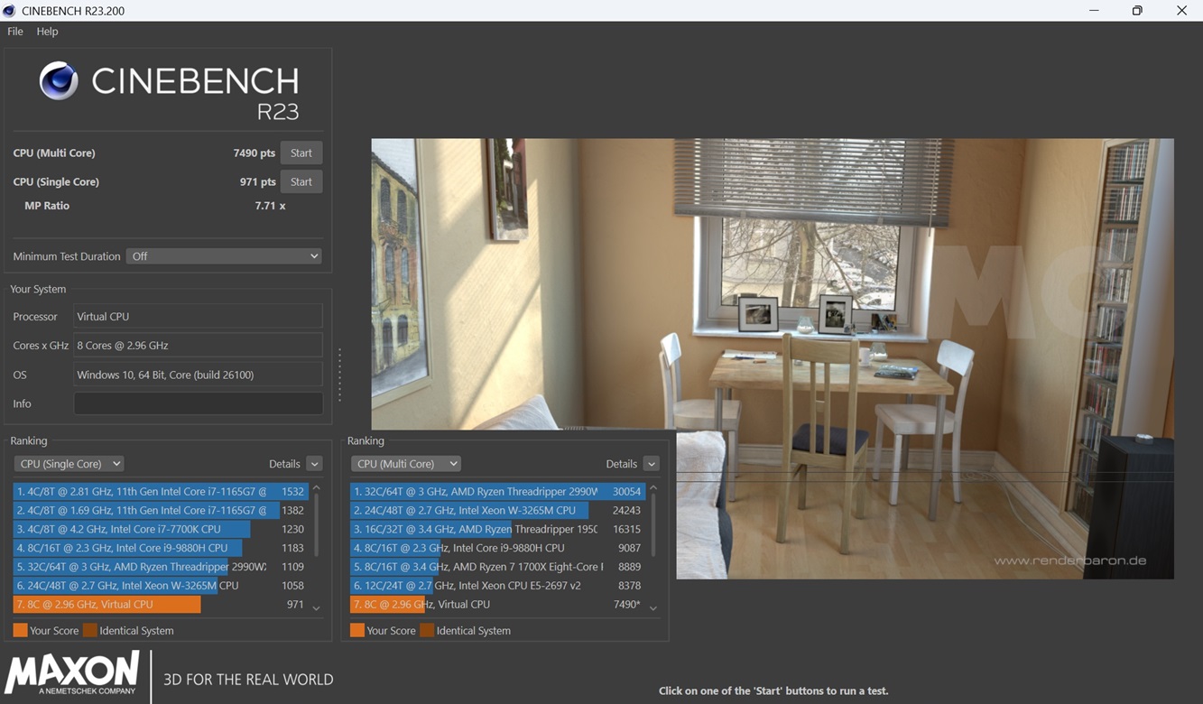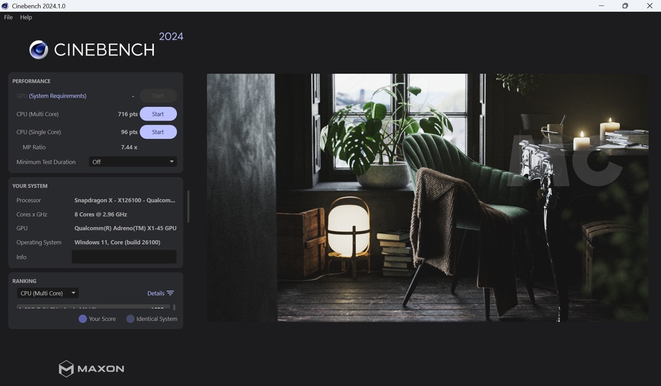 Otra prueba de renderizado por CPU que es muy exigente, y que nos permite medir a la perfección la potencia bruta de dos procesadores. El ASUS Zenbook A14 consiguió 971 puntos en monohilo y 7.490 puntos en multihilo, mientras que el Snapdragon Elite X del Vivobook logró 1.085 puntos en monohilo y 11.756 puntos en multihilo.