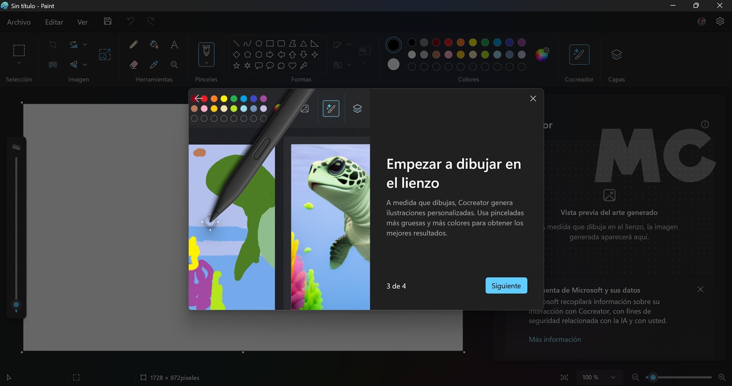 Antes de nada vamos a repasar qué tenemos disponible en Microsoft Copilot+. El cocreador de Paint es, sin duda, una de las funciones más interesantes, ya que como os he comentado en análisis anteriores nos permite convertir simples trazos en dibujos de alta calidad gracias a la IA. Esta aplicación también ofrece funciones de relleno y eliminación generativa por IA, lo que nos permite quitar cosas de la imagen y añadir elementos de forma «natural».