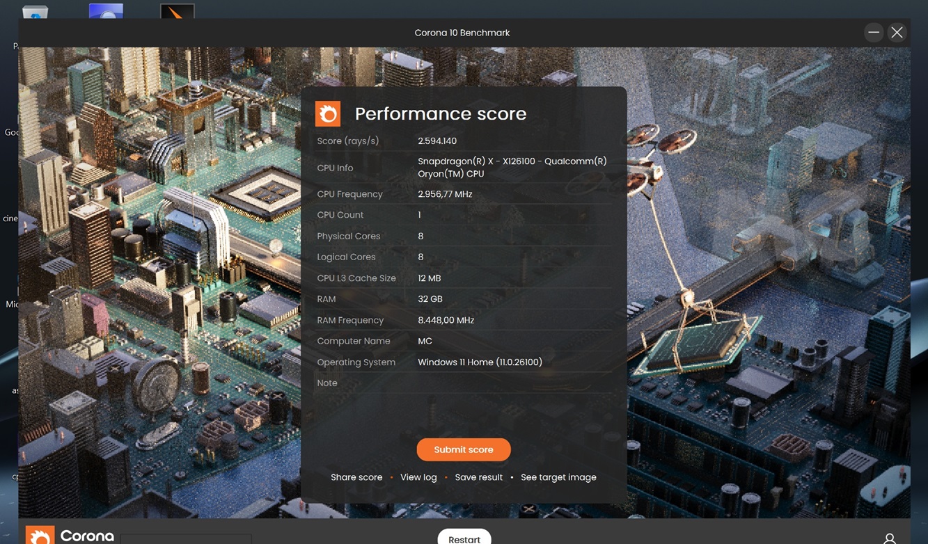 Esta prueba mide la cantidad de rayos por segundo que es capaz de generar un procesador. El ASUS Zenbook A14 con Snapdragon X X1 26 100 registra un resultado de 2.594.140 de rayos por segundo, y el Snapdragon X Elite X1E 78 100 alcanza los 4.053.841 rayos por segundo. La diferencia de potencia entre ambos es importante.