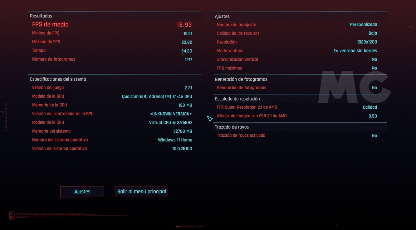 Por último tenemos a Red Dead Redemption 2, un juego que se cerraba automáticamente al terminar la pantalla de carga. No conseguí hacerlo funcionar, así que no pude medir el rendimiento. Es curioso, porque con el Snapdragon X Elite X1E 78 100 el juego sí funcionó, aunque con una media de 22 FPS con FSR en modo calidad y todo configurado en calidad baja.