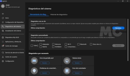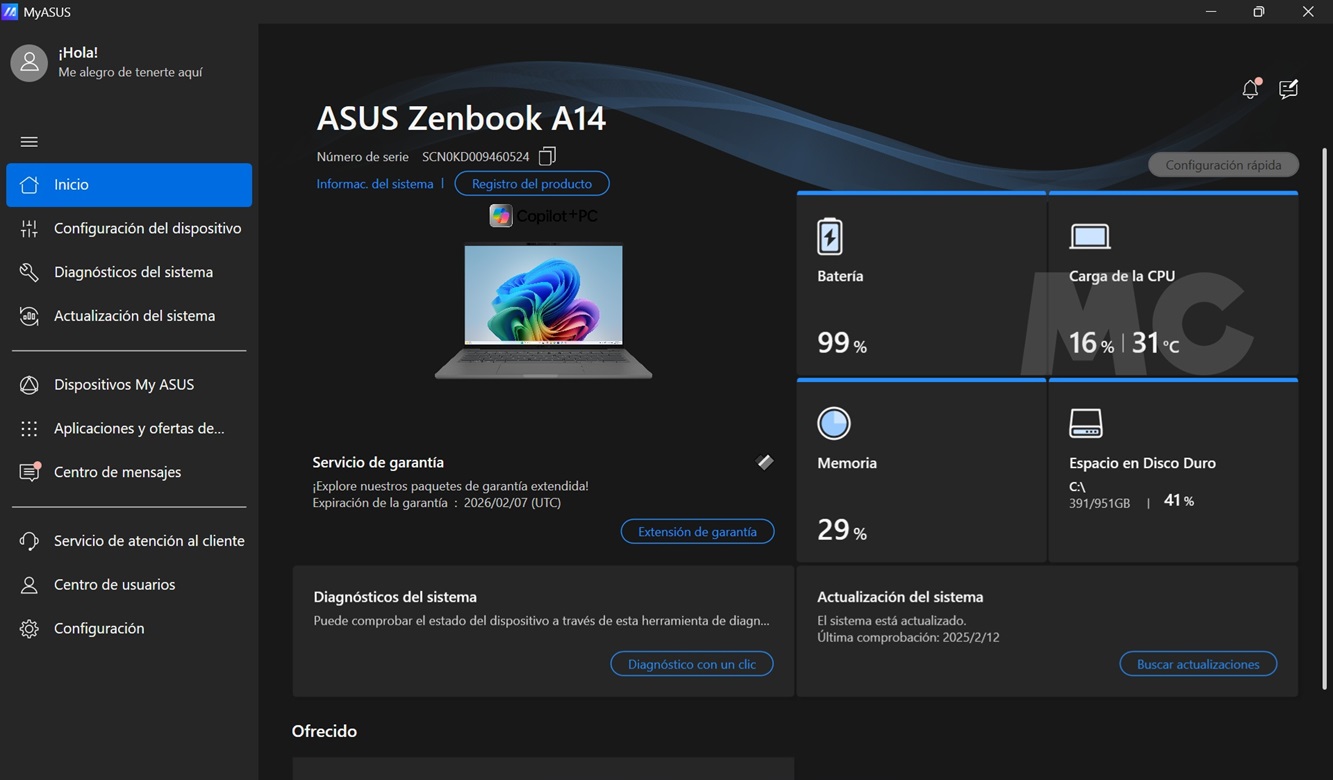 El ASUS Zenbook A14 viene con el software MyASUS, que nos permite configurar y personalizar ajustes importantes con unos simples clics. También nos permite visualizar el estado del equipo, y nos da la posibilidad de buscar y descargar actualizaciones de una manera sencilla y centralizada. En la galería adjunta podéis verlo con más detalle.