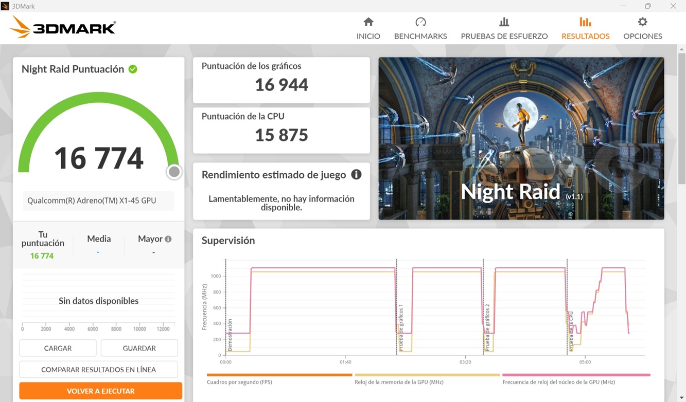 Para completar el conjunto de pruebas de rendimiento en juegos he querido añadir Night Raid, que es una prueba mucho menos exigente que las anteriores, y que está pensada para GPUs integradas. En esta, el Snapdragon X X1 26 100 consigue 16.774 puntos, un poco por encima de la puntuación media que registra en esta prueba un portátil para ofimática de 2023.