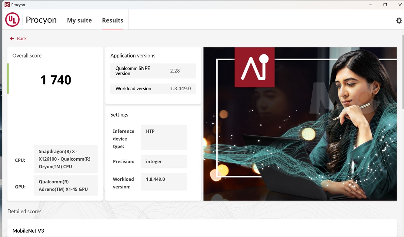Terminamos con una prueba centrada en IA que nos permite medir el desempeño de la NPU que integra el SoC utilizado en el ASUS Zenbook A14. Esos 1.740 puntos la colocan al mismo nivel que la NPU que trae el SoC Snapdragon X Elite X1E 78 100, lo que significa que no hay ningún tipo de sacrificio si hablamos de rendimiento en IA avanzada.