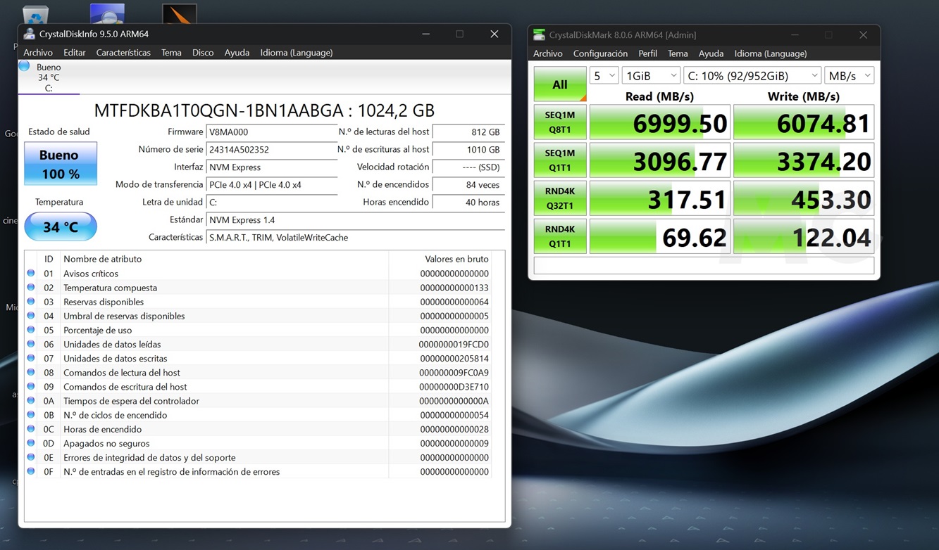 El rendimiento que ofrece la unidad SSD que monta el ASUS Zenbook A14 es excelente, de lo mejor que hemos visto en equipos de su clase, ya que se acerca a los 7 GB/s en lectura secuencial, y supera los 6 GB/s en escritura secuencial, manteniendo además unas temperaturas óptimas en todo momento.
