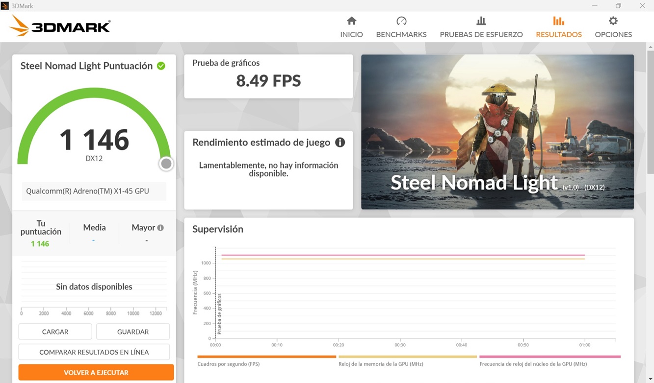 Steel Nomad Light es una prueba mucho más ligera que nos permite medir el rendimiento en juegos. Esos 8,49 FPS no son un buen resultado, y confirman lo que ya sabemos, que el ASUS Zenbook A14 no es un portátil diseñado para jugar.
