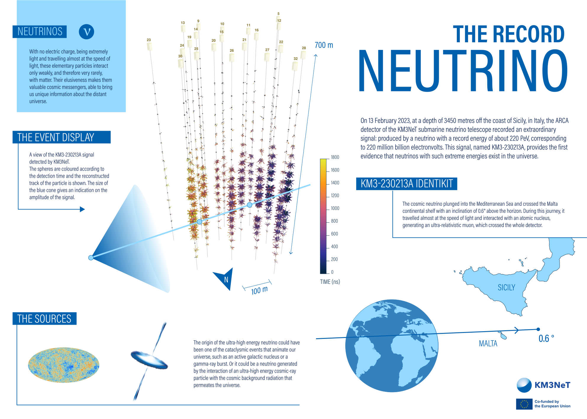 En el mar Mediterráneo, a gran profundidad, un telescopio submarino ha captado un evento sin precedentes. El 13 de febrero de 2023, el detector ARCA del experimento KM3NeT registró el paso de una partícula con una energía estimada de 220 petaelectronvoltios (PeV). Se trata del neutrino más energético jamás observado, un hallazgo que se ha publicado recientemente en la revista Nature y que supone un hito en la astronomía de partículas. Este fenómeno, bautizado como KM3-230213A, fue identificado a través de la detección de un muón, una partícula cargada que atravesó el detector submarino activando más de un tercio de sus sensores. Su inclinación y energía sugieren que se generó tras la colisión de un neutrino cósmico con materia cercana al telescopio, un vestigio de los grandes procesos interestelares que han dejado huella en nuestro planeta.