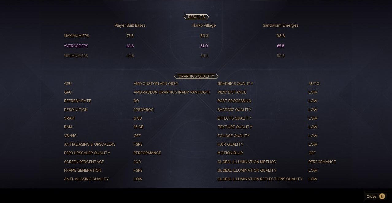 Pues porque el benchmark funciona bastante bien en una Steam Deck, configurado en calidad baja con AMD FSR3 en modo rendimiento, generación de fotogramas y resolución de 1.280 x 800 píxeles. El reescalado estaba configurado en modo rendimiento, algo que no sorprende, ya que lleva tiempo siendo un clásico para poder jugar en condiciones con esta consola a títulos actuales.