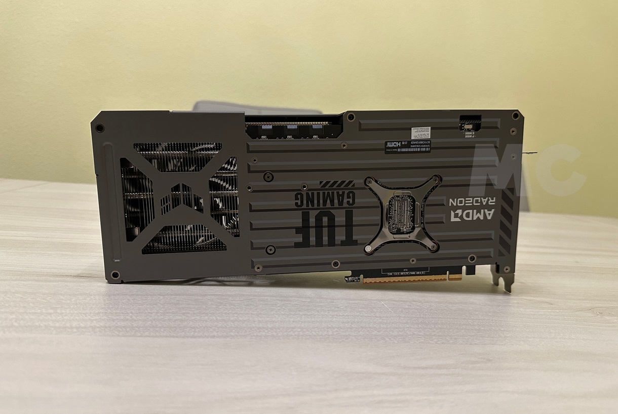 En la parte trasera tenemos una placa metálica que, como viene siendo habitual, juega un importante papel estructural y contribuye a las tareas de refrigeración. Justo en el extremo de la derecha se encuentra una apertura que facilita el flujo de aire por una de las zonas más calientes del radiador, un diseño que se ha convertido en un clásico en las tarjetas gráficas actuales.