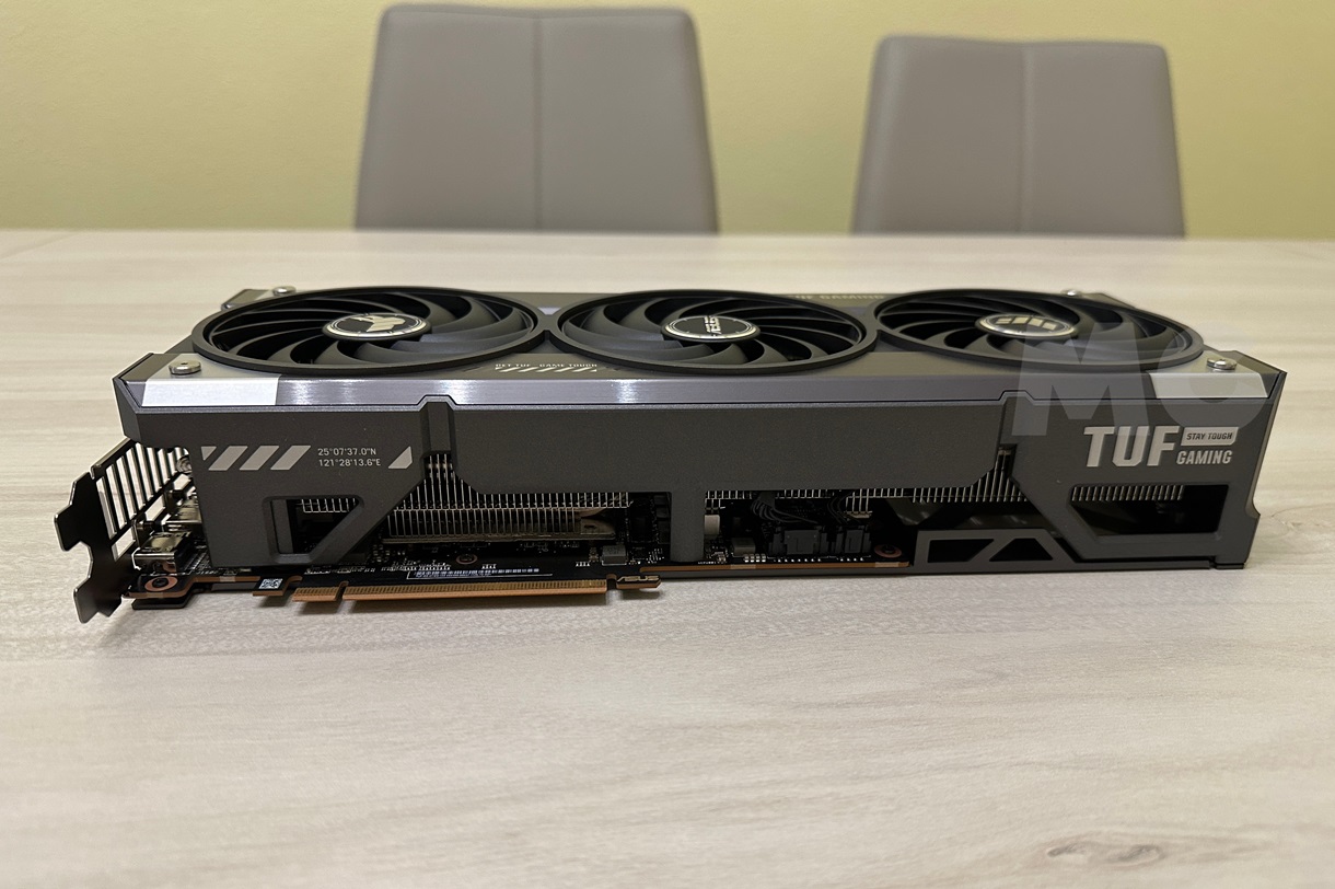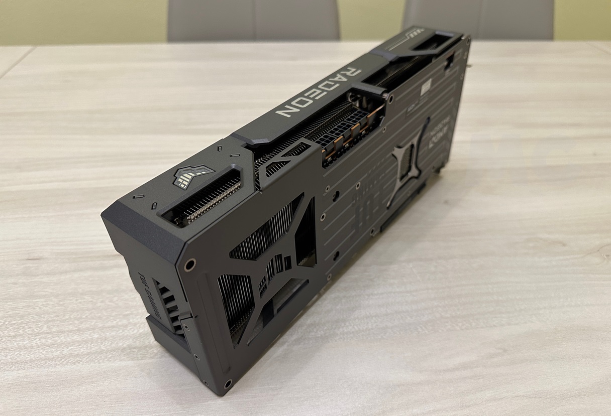 En el lateral podemos ver tres conectores de alimentación de 8 pines cada uno, lo que permite suministrar una potencia máxima de 350 vatios, a lo que debemos sumar los 75 vatios que puede obtener el PCB. También vemos la serigrafía Radeon y el logo TUF, que tiene iluminación LED RGB personalizable, y el interruptor de cambio de BIOS, que nos permite alternar entre el modo rendimiento y el modo silencioso.