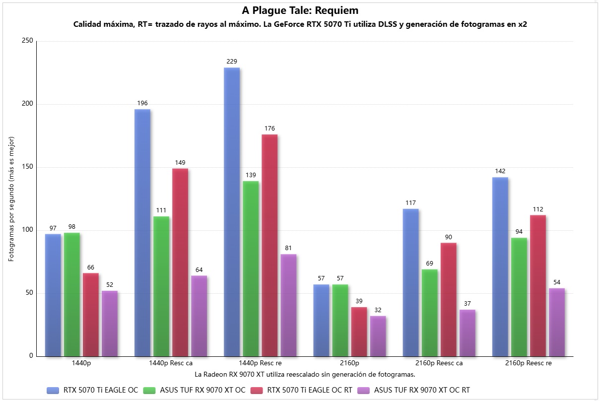 La ASUS TUF Gaming Radeon RX 9070 XT OC gana por 1 FPS en 1440p en A Plague Tale: Requiem bajo rasterización, empata en 4K y pierde con trazado de rayos activado. De nuevo se nota que la GeForce RTX 5070 Ti se desenvuelve mucho mejor con trazado de rayos activado.