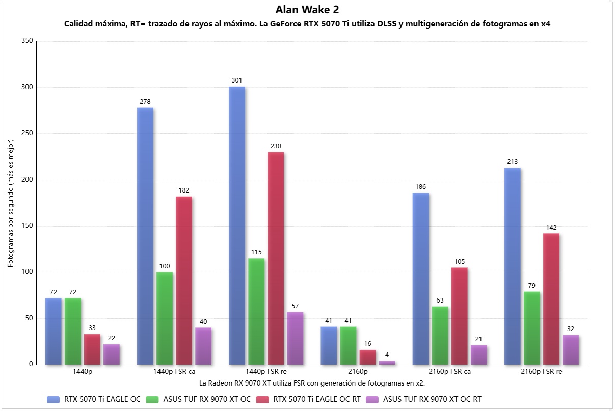 En Alan Wake 2 el resultado es muy curioso, porque ambas empatan en rasterización, un buen resultado para la ASUS TUF Gaming Radeon RX 9070 XT OC, pero esta pierde de forma contundente al activar el trazado de rayos. Al activar la multigeneración de fotogramas la diferencia entre ambas se agranda, y el modelo de NVIDIA consigue una mayor fluidez.