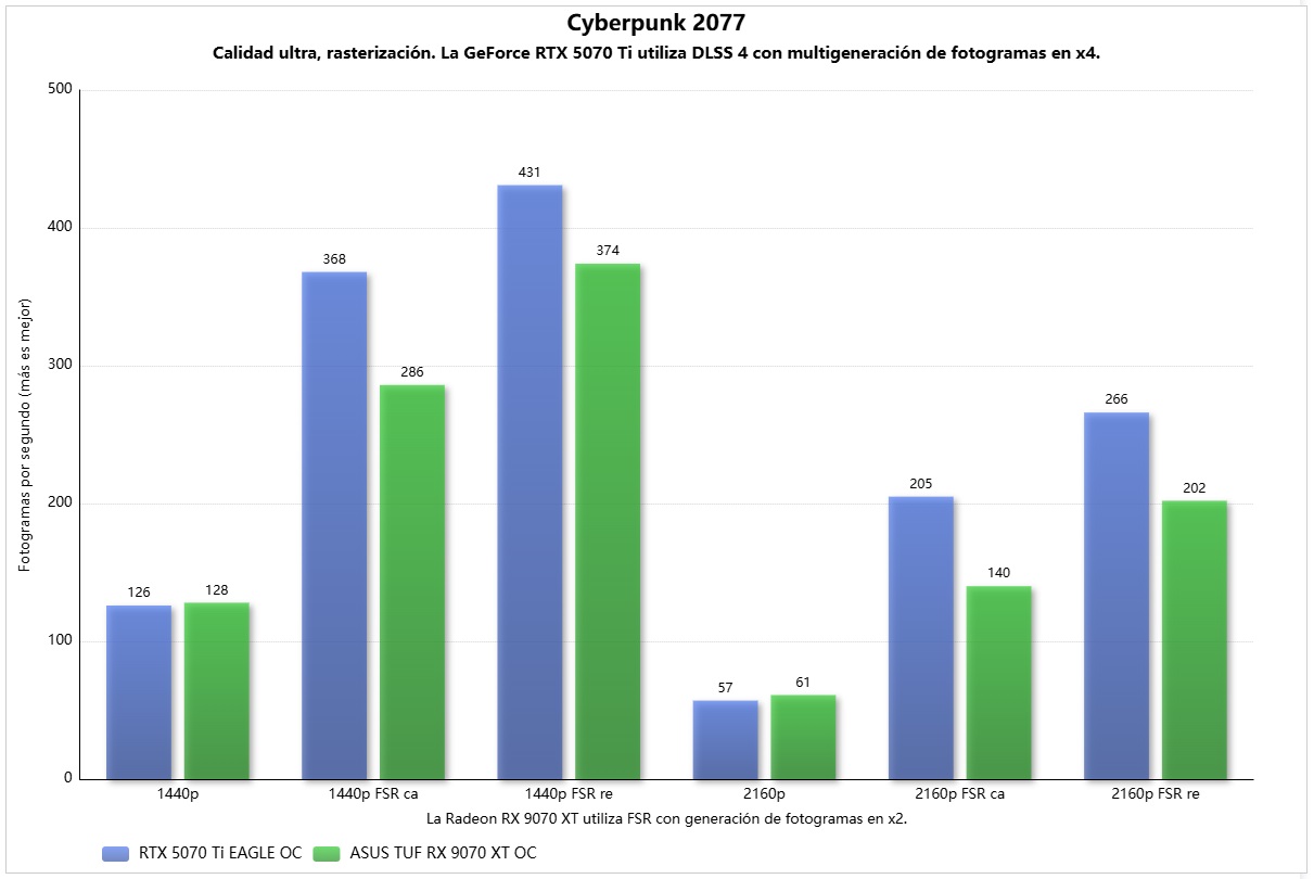 Cyberpunk 2077 es una victoria para la ASUS TUF Gaming Radeon RX 9070 XT OC en rasterización, y esta escala muy bien con FSR y generación de fotogramas, pero la multigeneración de fotogramas de la GeForce RTX 5070 Ti en modo x4 vuelve a marcar la diferencia.