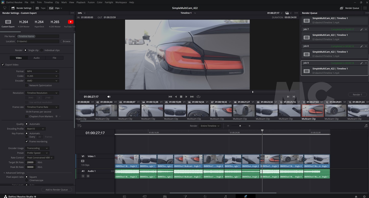 En esta prueba no podemos utilizar la misma configuración con la Radeon RX 9070 XT que con la GeForce RTX 5070 Ti, pero he querido incluirla para que tengáis una referencia. La gráfica de NVIDIA acelera por hardware el estándar H.265 4:2:2 de 10 bits, y termina el trabajo de renderizado en 10 segundos.