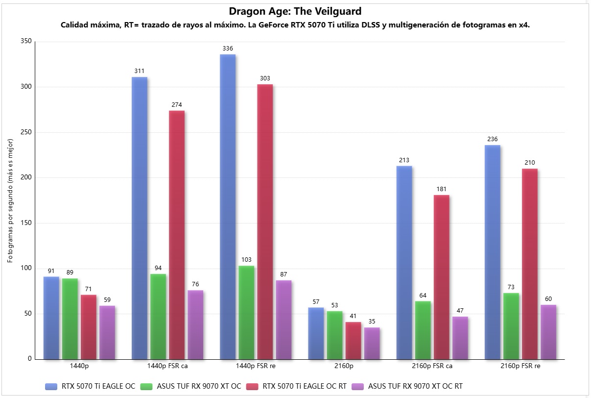 En Dragon Age: The Veilguard la ASUS TUF Gaming Radeon RX 9070 XT OC pierde por poco ante la GeForce RTX 5070 Ti, que se impone por un 7,55% en 4K. Con trazado de rayos la diferencia a favor de la gráfica de NVIDIA se acentúa, y DLSS 4 en modo x4 crea diferencias gigantescas, porque en la ASUS TUF Gaming Radeon RX 9070 XT OC no estaba activado ningún tipo de generación de fotogramas.
