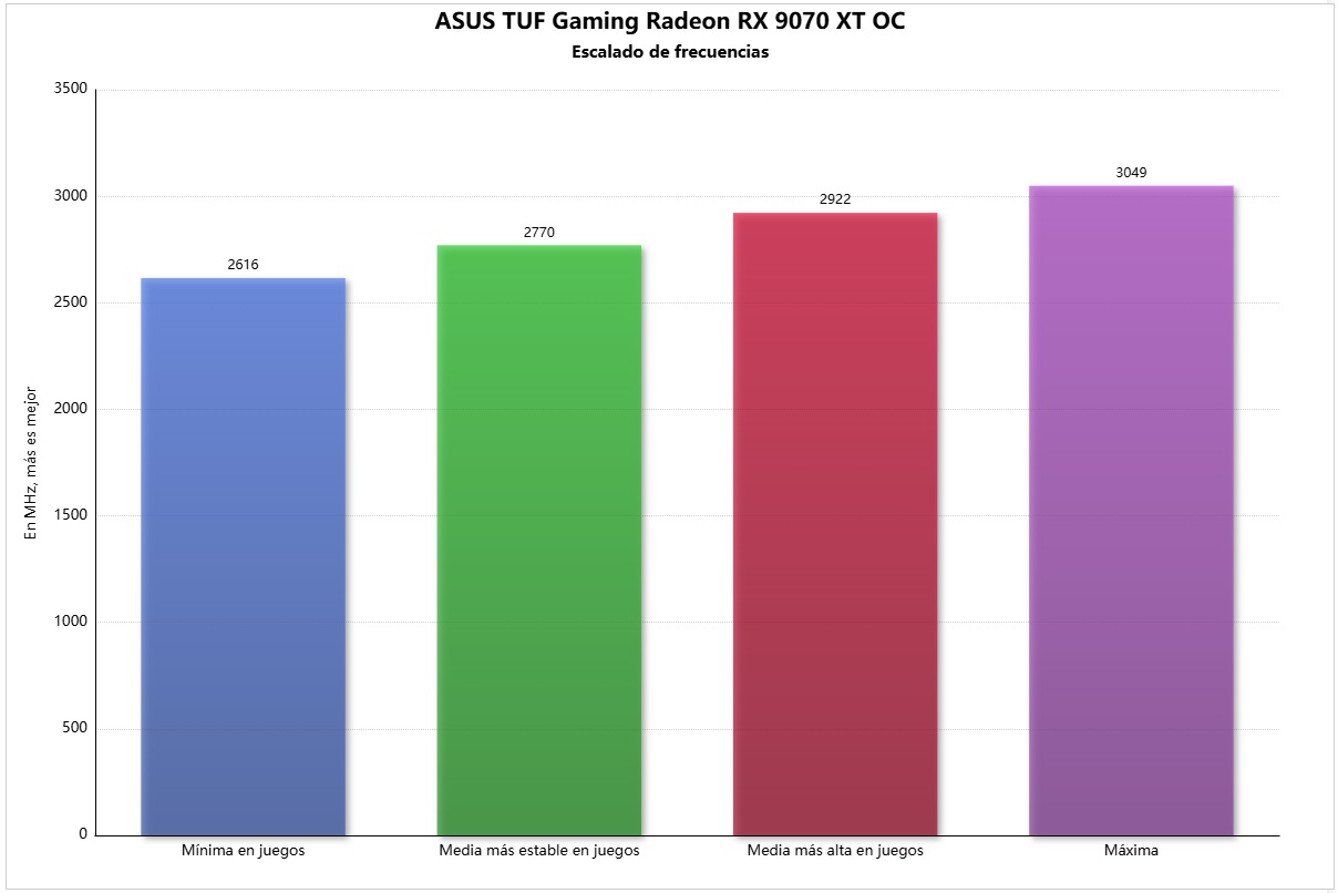 Las frecuencias de trabajo de la ASUS TUF Gaming Radeon RX 9070 XT OC oscilan considerablemente, y esto produce pequeños saltos en las tasas de FPS, pero nada alarmante. Cuando tenemos activado trazado de rayos la velocidad de la GPU tiende a disminuir bastante, mientras que en rasterización es cuando más elevadas suelen ser las frecuencias.