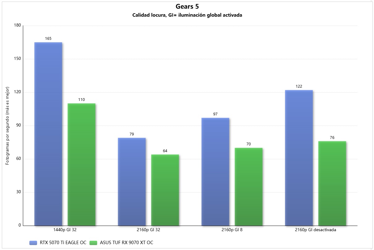 Los resultados que he obtenido en Gears 5 con la ASUS TUF Gaming Radeon RX 9070 XT OC son muy raros, y me hacen pensar que puede haber algún tipo de problema a nivel de drivers, porque las diferencias a favor de la GeForce RTX 5070 Ti son demasiado grandes.