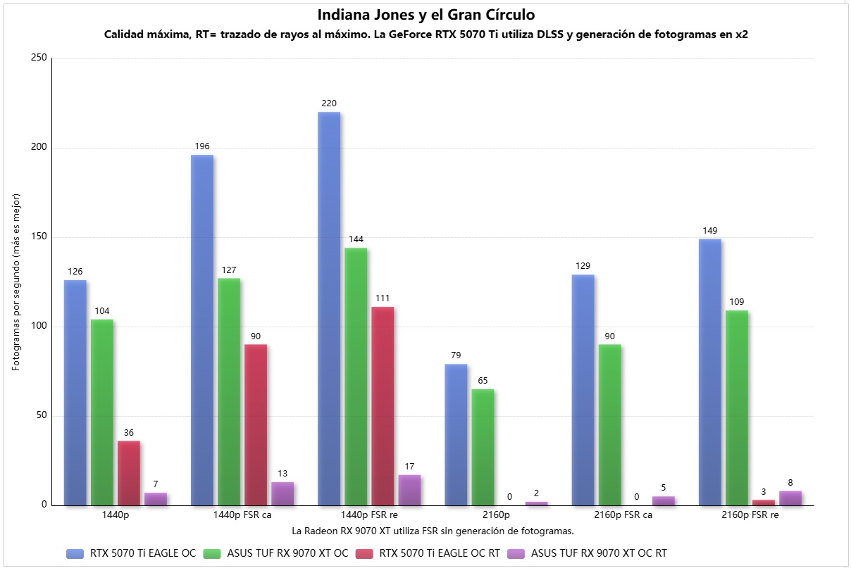 En Indiana Jones y el Gran Círculo la GeForce RTX 5070 Ti se alza con una victoria muy clara, tanto en rasterización como con trazado de rayos activado. La ASUS TUF Gaming Radeon RX 9070 XT OC tiene serios problemas con el trazado de rayos en este juego, aunque curiosamente no llega a cerrarse en 4K cuando excede el consumo de memoria gráfica.